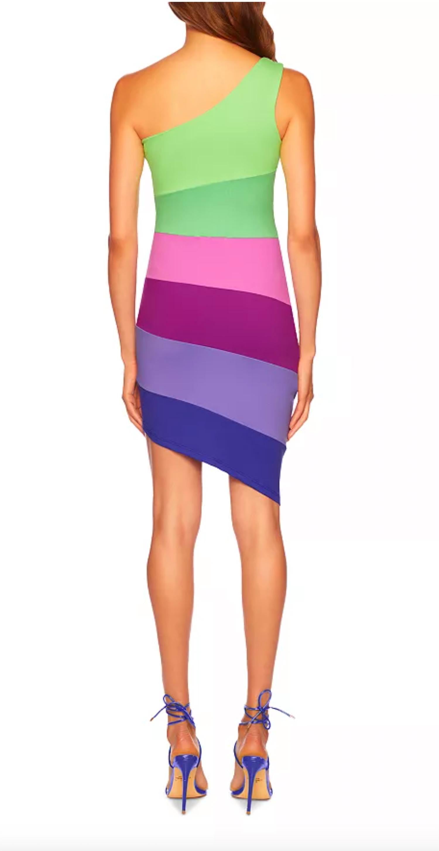 The kind of easy and flattering dress you'll be reaching for all season long. Get ready to make a statement at your next cocktail party with the Susana Monaco Colorblock One Shoulder Mini Dress in a stunning Maldives stripe pattern. This sleeveless, off-the-shoulder bodycon silhouette is crafted from a nylon blend for a perfect fit, measuring 16-25 inches from the waist. Designed for easy wear, it features a convenient pull-on closure. Care for this Y2K-inspired piece is a breeze, as it's machine washable.