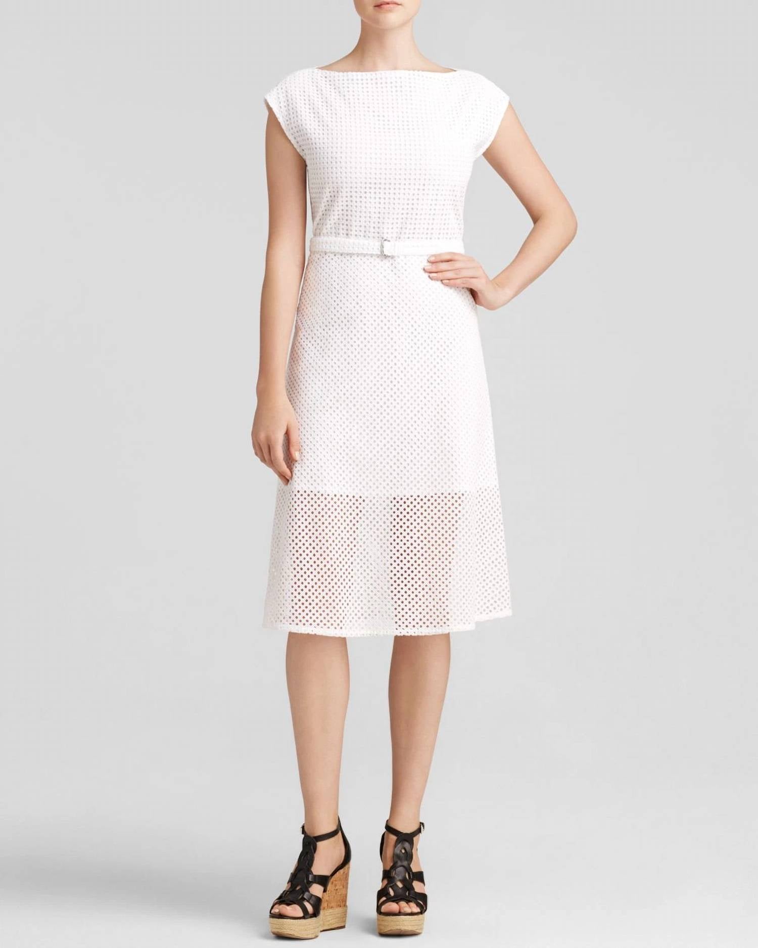 The kind of easy and flattering dress you'll be reaching for all season long. Introducing the Afala Midi Dress by Theory, a stunning sheath silhouette perfect for minimalist wedding attire. This white Eyelet Cube dress features cap sleeves and a textured pattern, complemented by a sophisticated boatneck design. The dress offers a flattering fit with its zip closure, ideal for spring celebrations like the 4th of July. For best care, it is recommended to dry clean only.