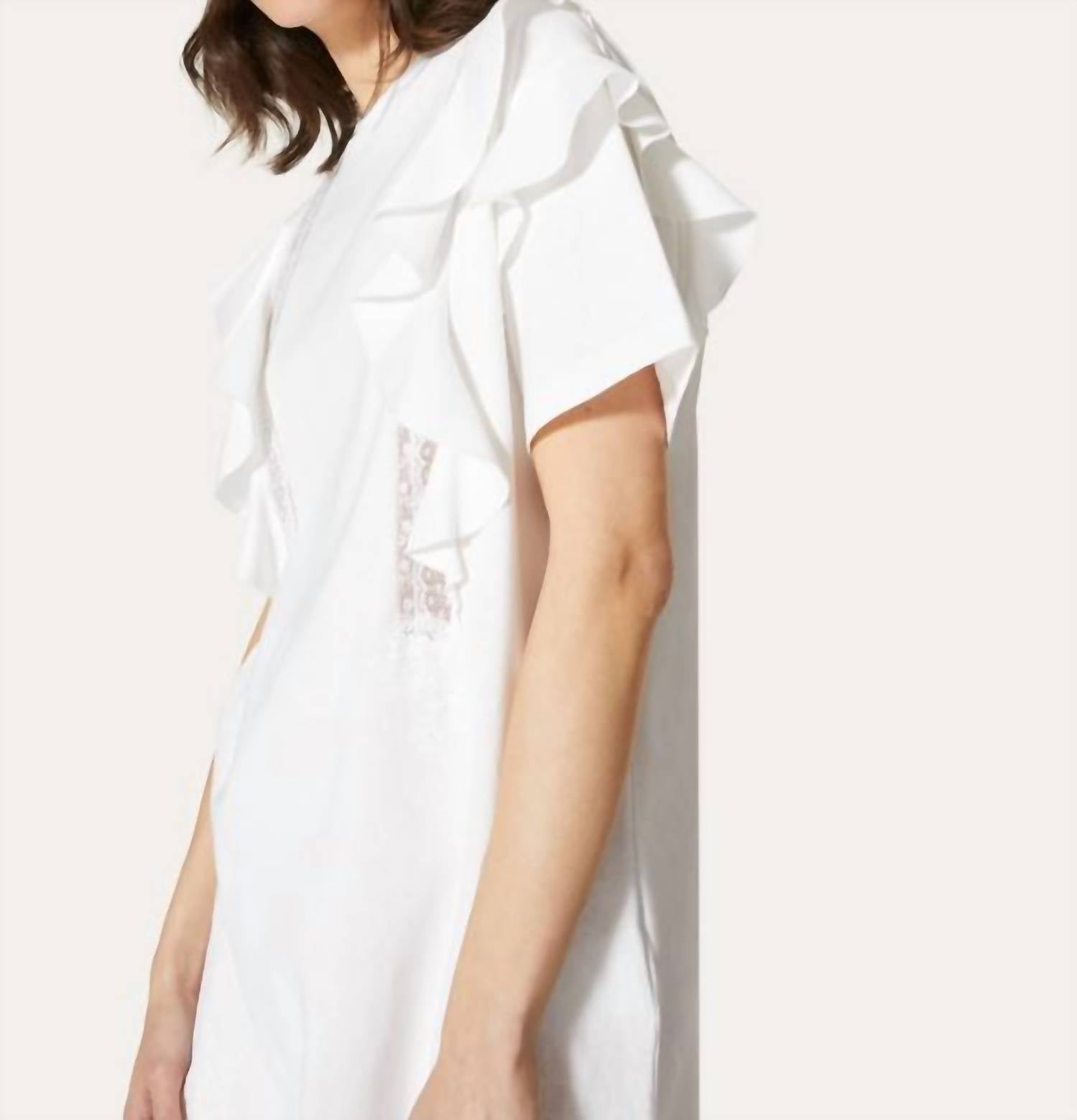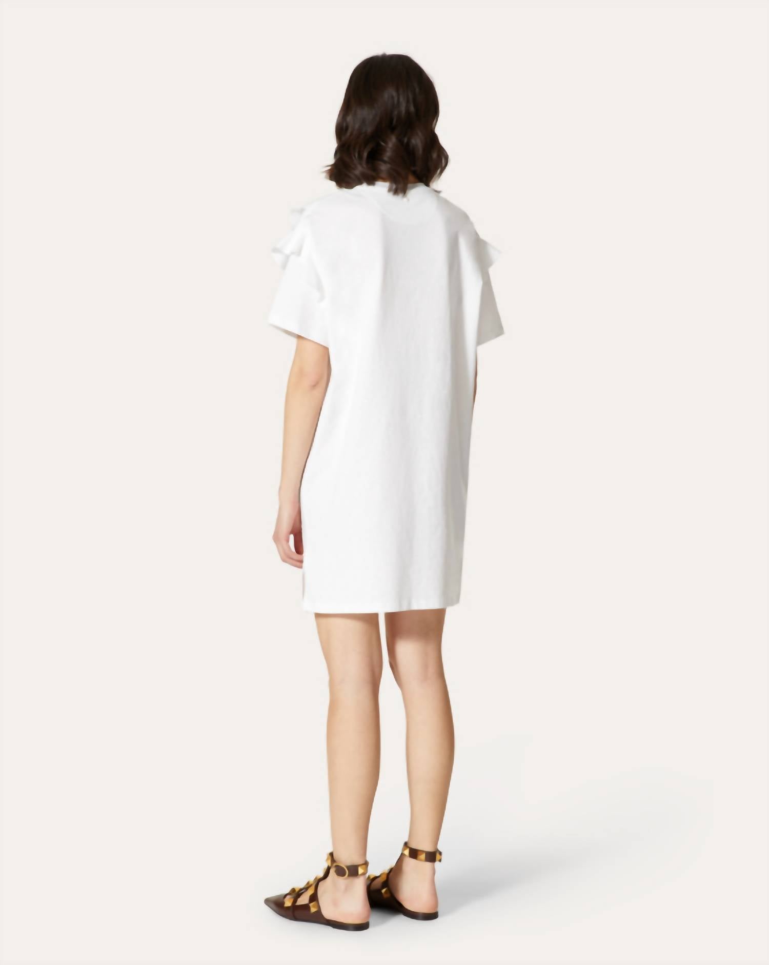 The kind of easy and flattering dress you'll be reaching for all season long. Experience effortless elegance with the Valentino Plain Knit Fabric and Lace T-shirt Dress, perfect for a dinner party or minimalist spring occasion. This white mini dress features short sleeves and a crewneck, crafted from 100% cotton for a soft touch. Made in Italy with a pull-on closure, it boasts intricate lace inlay and pleated details for a sophisticated silhouette. The model is 176 cm tall and is wearing a size S.