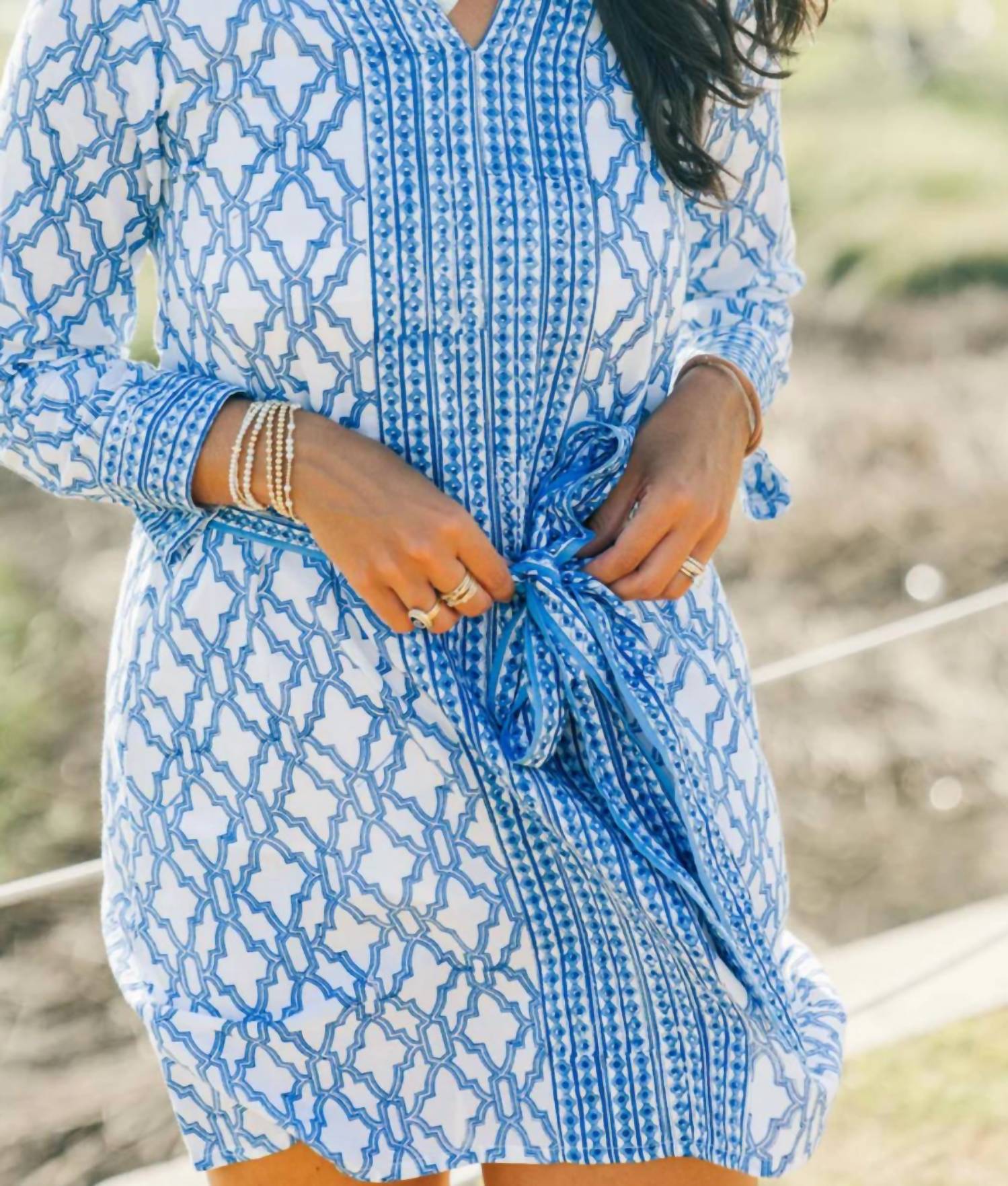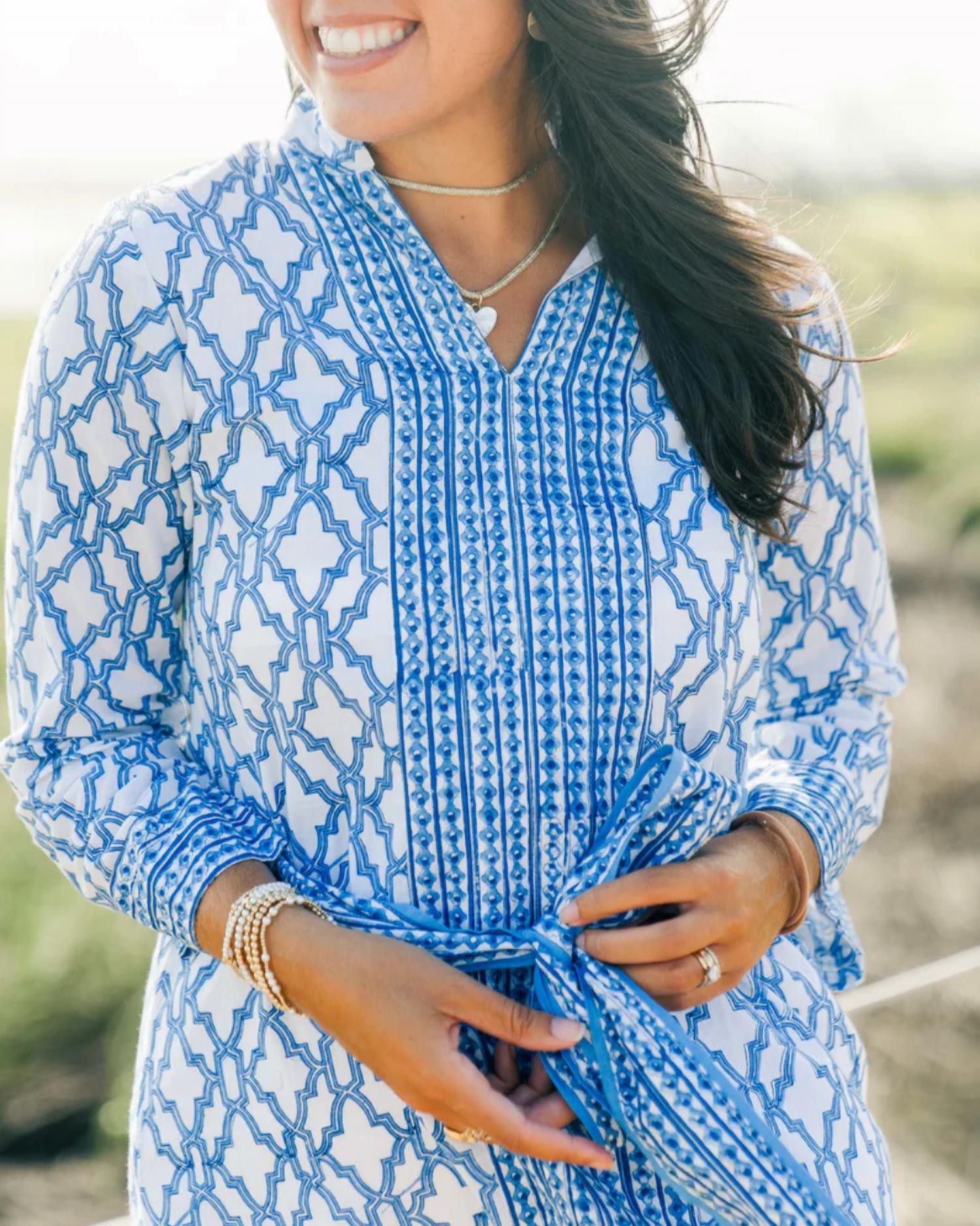 The perfect mini dress for those warmer months. Introducing the French Mini Quarters by VICTORIA DUNN, a perfect summer staple in a vivid Royal Trellis print. This boho chic sheath dress features three-quarter bell sleeves and a ruffled collar for an elegant touch. Made from 100% cotton and lined, it is hand-blocked by artisans in Jaipur, India to infuse authenticity into your wardrobe. Care: Hand wash only. Model is wearing a size XS.