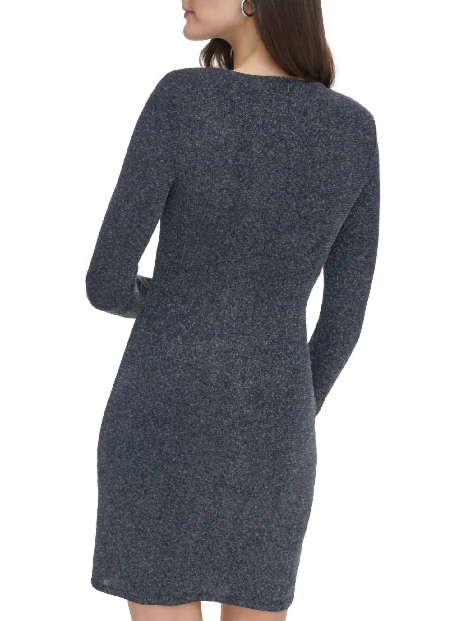 The kind of easy and flattering dress you'll be reaching for all season long. Introducing the Asymmetric Metallic Long Sleeve Dress by VINCE CAMUTO, an elegant choice in a striking Navy/Silver hue perfect for a dinner party. Expertly crafted from a Nylon blend, this dress showcases a luxurious lurex metallic knit and a bodycon silhouette that accentuates your figure. Featuring long sleeves, a chic asymmetrical neckline, and side ruched detail, it sits above the knee at approximately 38". Closure is a back zip, and for care, simply hand wash and lay flat to dry.