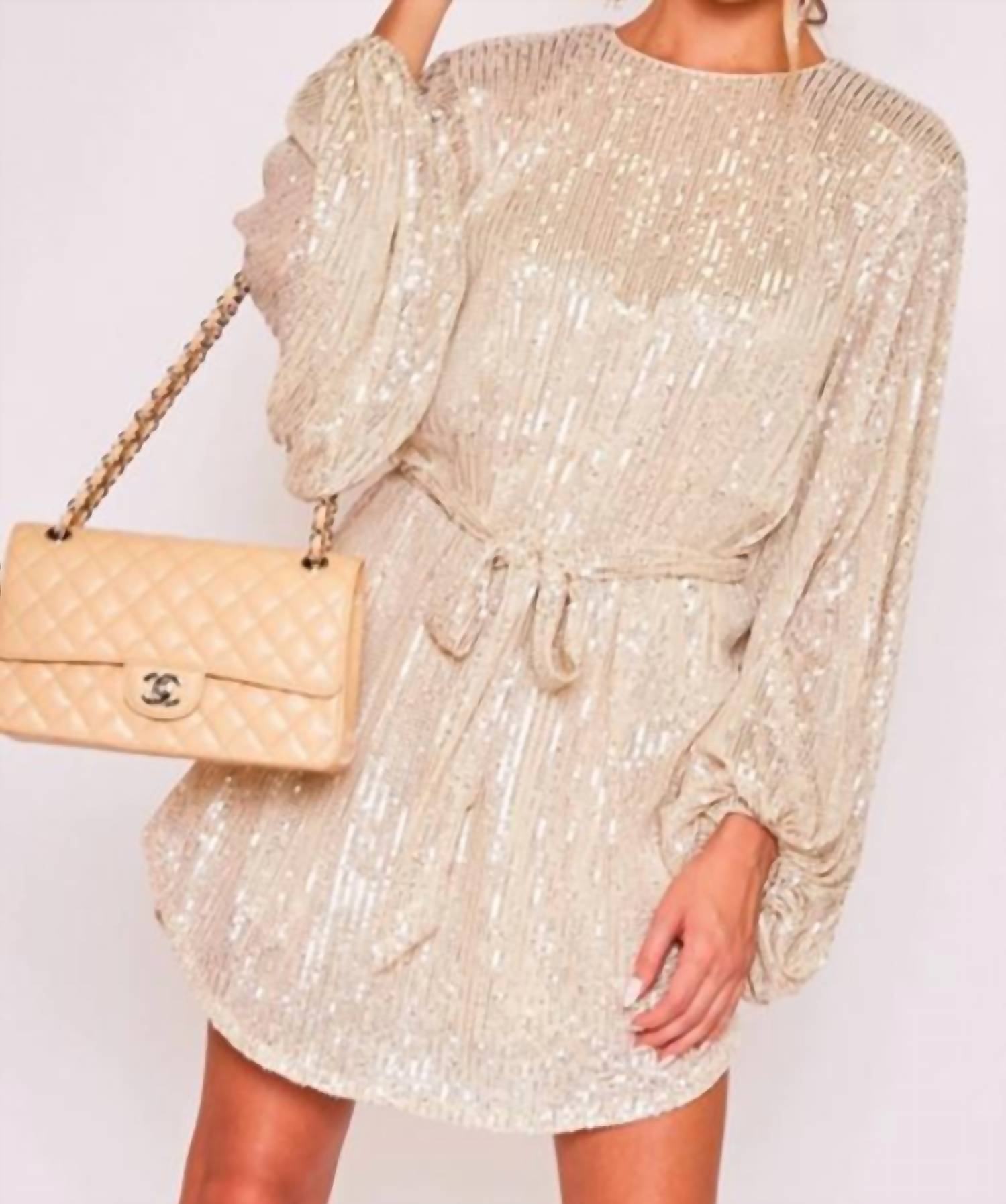 A short and breezy dress for those warmer days. Step into sophistication with the Gold Sequin Dress by Vine & Love, designed to dazzle at any cocktail party or special occasion. This elegant mini dress features long sleeves and is crafted from luxurious acrylic material, complete with a self-tie closure for a flattering fit. The silhouette is enhanced by a crewneck and a shift-style bodice, adorned with gold sequins for a touch of glamour. Care instructions include hand washing and line drying to maintain its lustrous appearance.