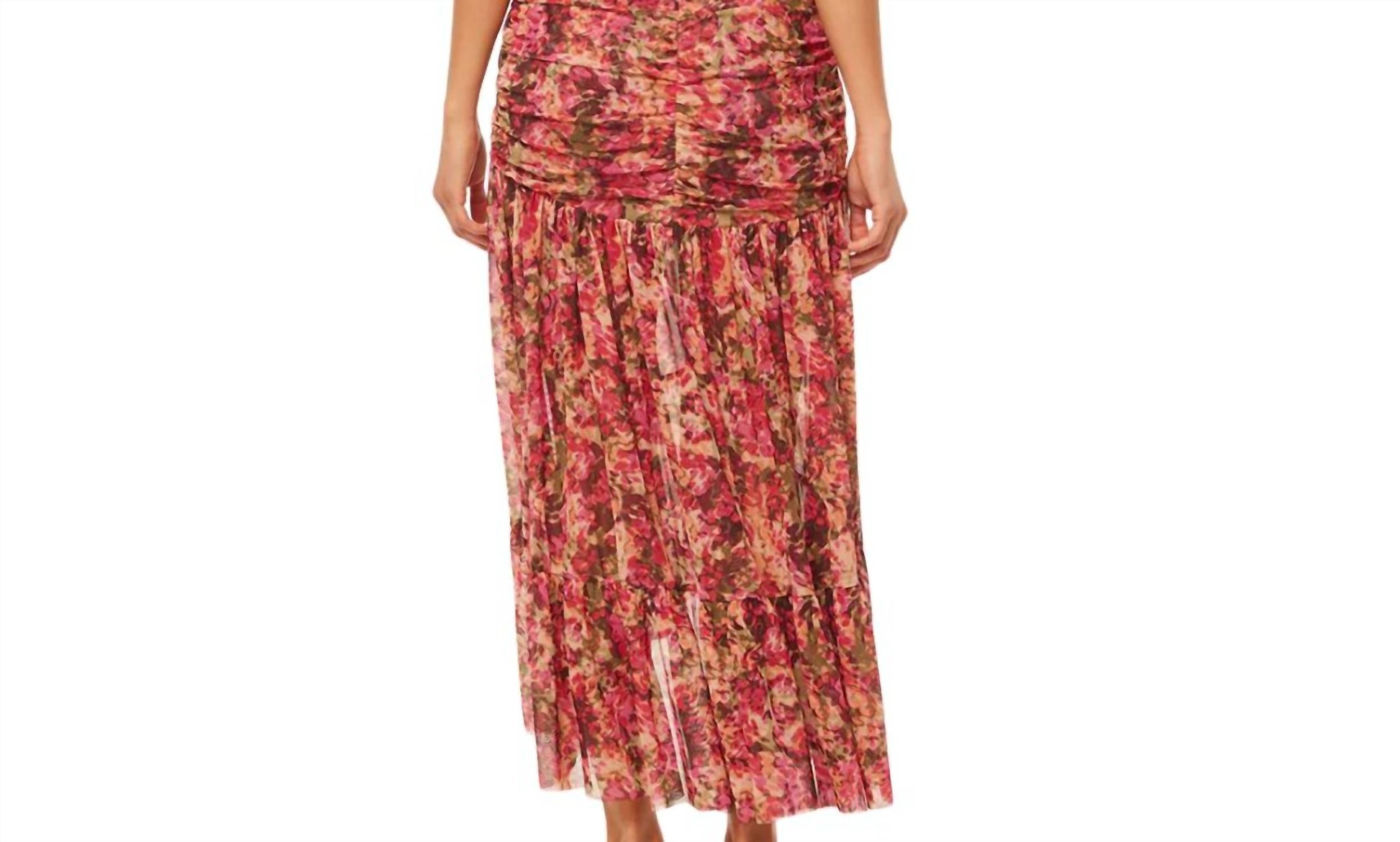 A maxi dress that is just as cute as it is comfortable. Misa Ava Dress Poly, Spandex in Sedona Abstract Maxi Dress Sleeveless Deep V-neckline Gathered Waist High-Low Hem Wide Ruffle Detail Printed Mesh  True to Size Dry Clean Made in the U.S.A.