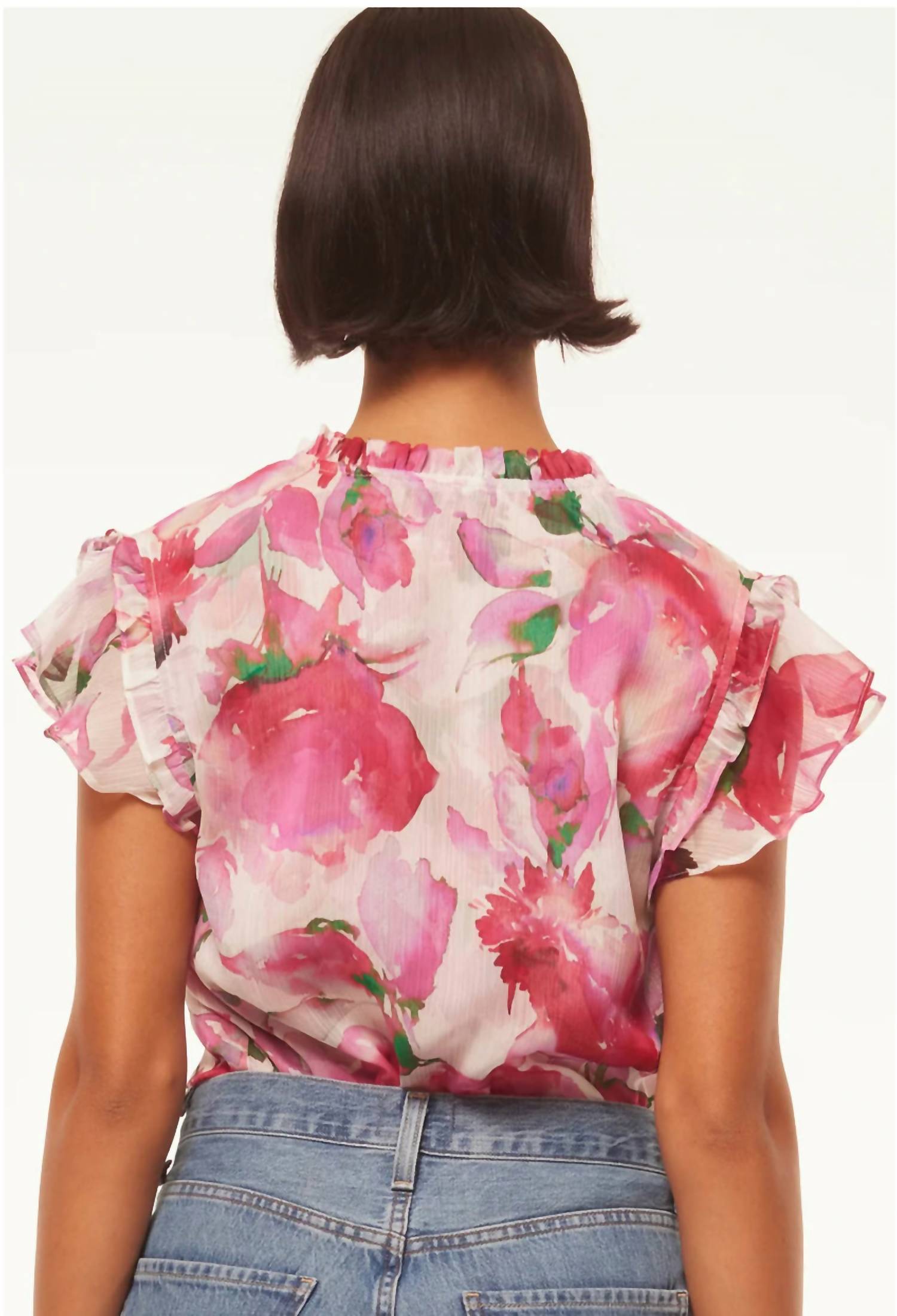 A timeless blouse that will never go out of style. Embrace the vibrant allure of the MISA Los Angeles Basia Floral Print Chiffon Top in Garden Fuchsia. This eye-catching blouse features cap sleeves with tiered ruffles and a ruffle-trimmed split neckline accented by petal tassel ties for a playful touch. Made from 100% poly chiffon, this top is a summer essential, and it proudly boasts Made in the USA quality. Closure: Tie. Care: Dry clean only.