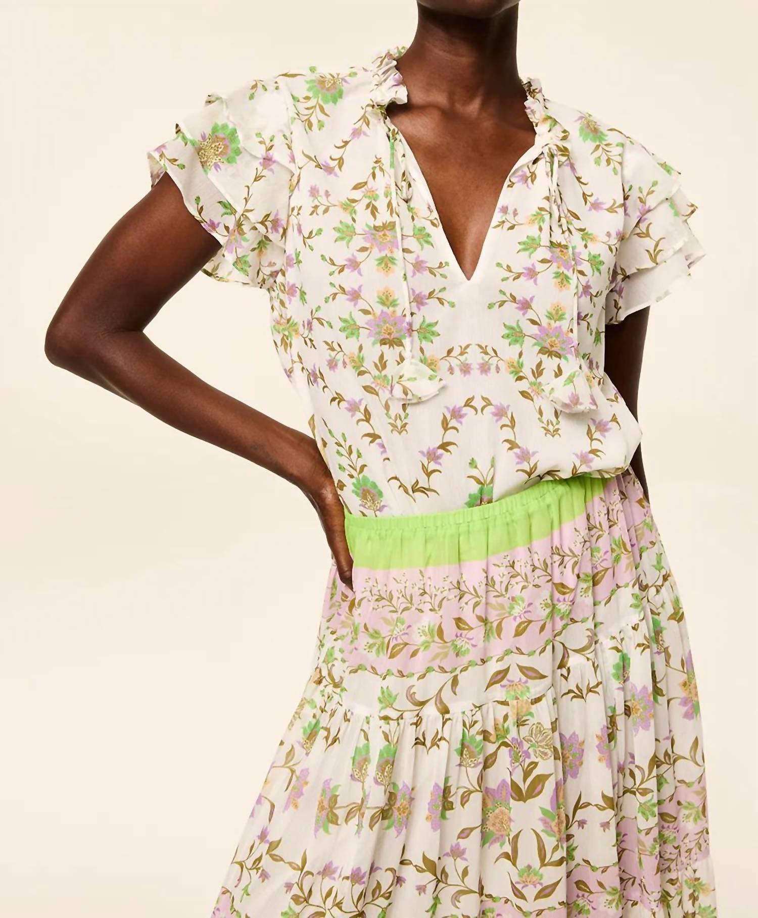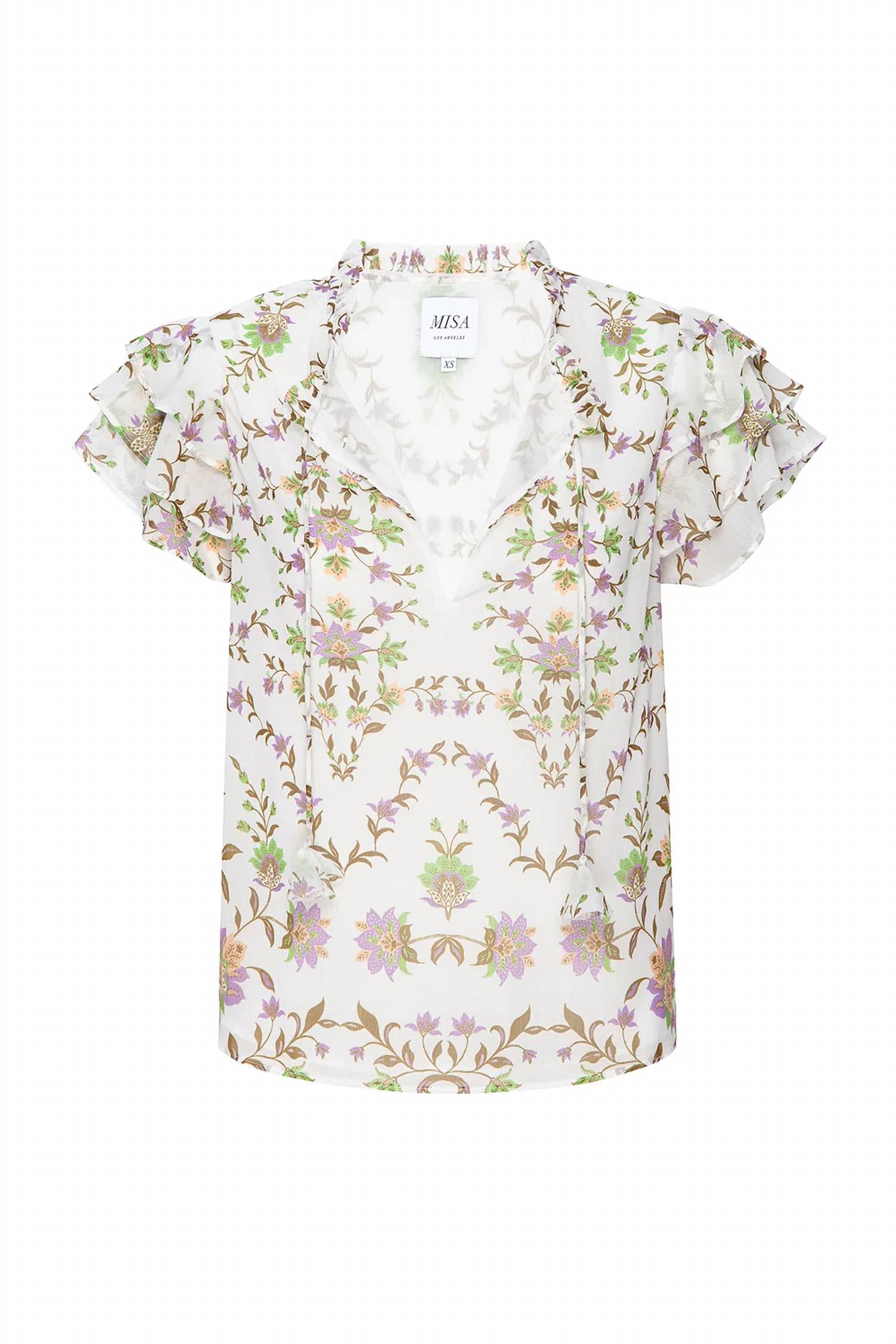 Cut from a gorgeous floral Italian crinkle chiffon with shimmering silver lurex, the Maria top is an easy silhouette with short, tiered ruffle sleeves and a ruffle trimmed split neckline with our signature petal tassel ties. The body is self-lined. Pair this style with the coordinating Marion skirt for the perfect Spring-ready set.Made in the USA. Dry Clean.98% Polyester 2% Metallic.Model Measurements: Height 5'9", Waist 24, Bust 30, Hips 35.Model is wearing size XS.