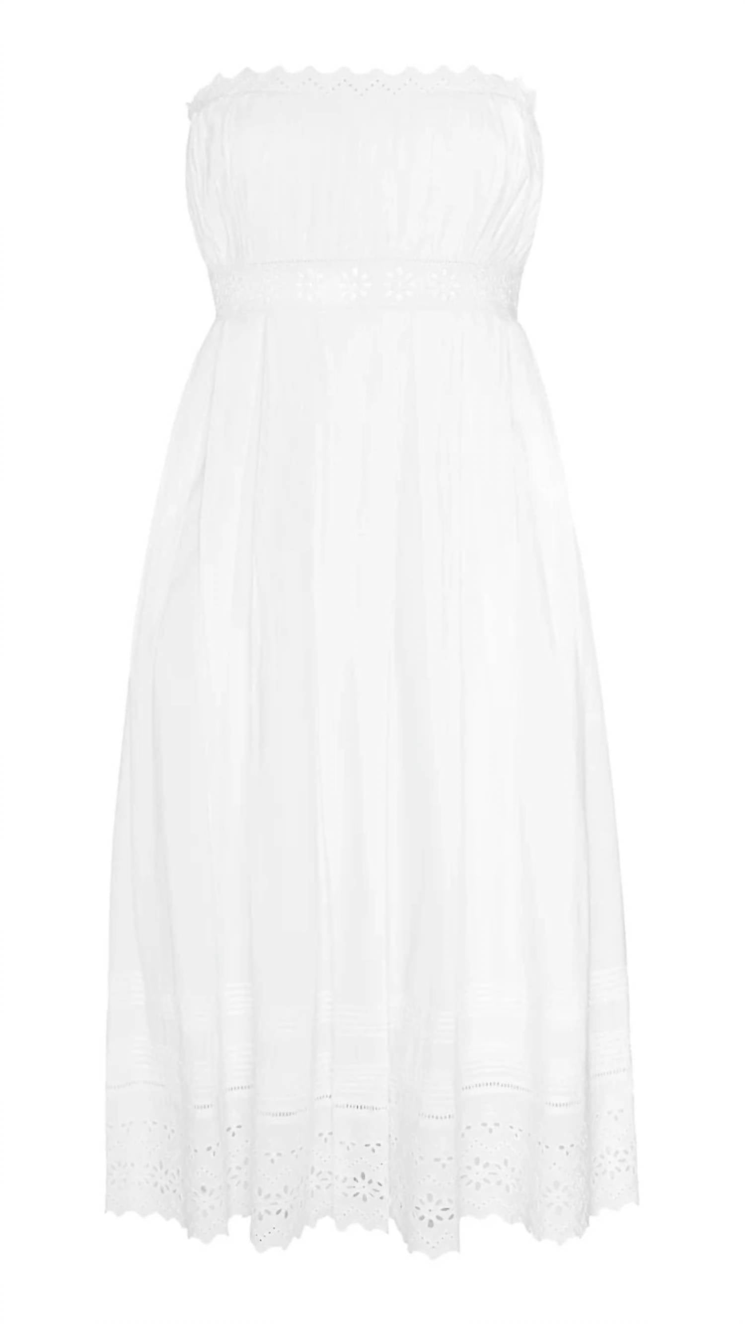The perfect length dress does exist. Embrace a boho chic style with the Persis Strapless Eyelet Cotton Midi Dress by Misa Los Angeles. This feminine dress in cream features a stylish strapless neckline, scalloped eyelet trim, and floral eyelet embroidery, enhanced by soft gathers and a pleated bodice for an elegant A-line silhouette. Crafted from 100% cotton, it offers the convenience of hidden side zip closure and side slit pockets. Care for this piece with dry cleaning to maintain its pristine condition. Modeled in size small (5'7.5" height, 34" bust, 26" waist, 37" hips).