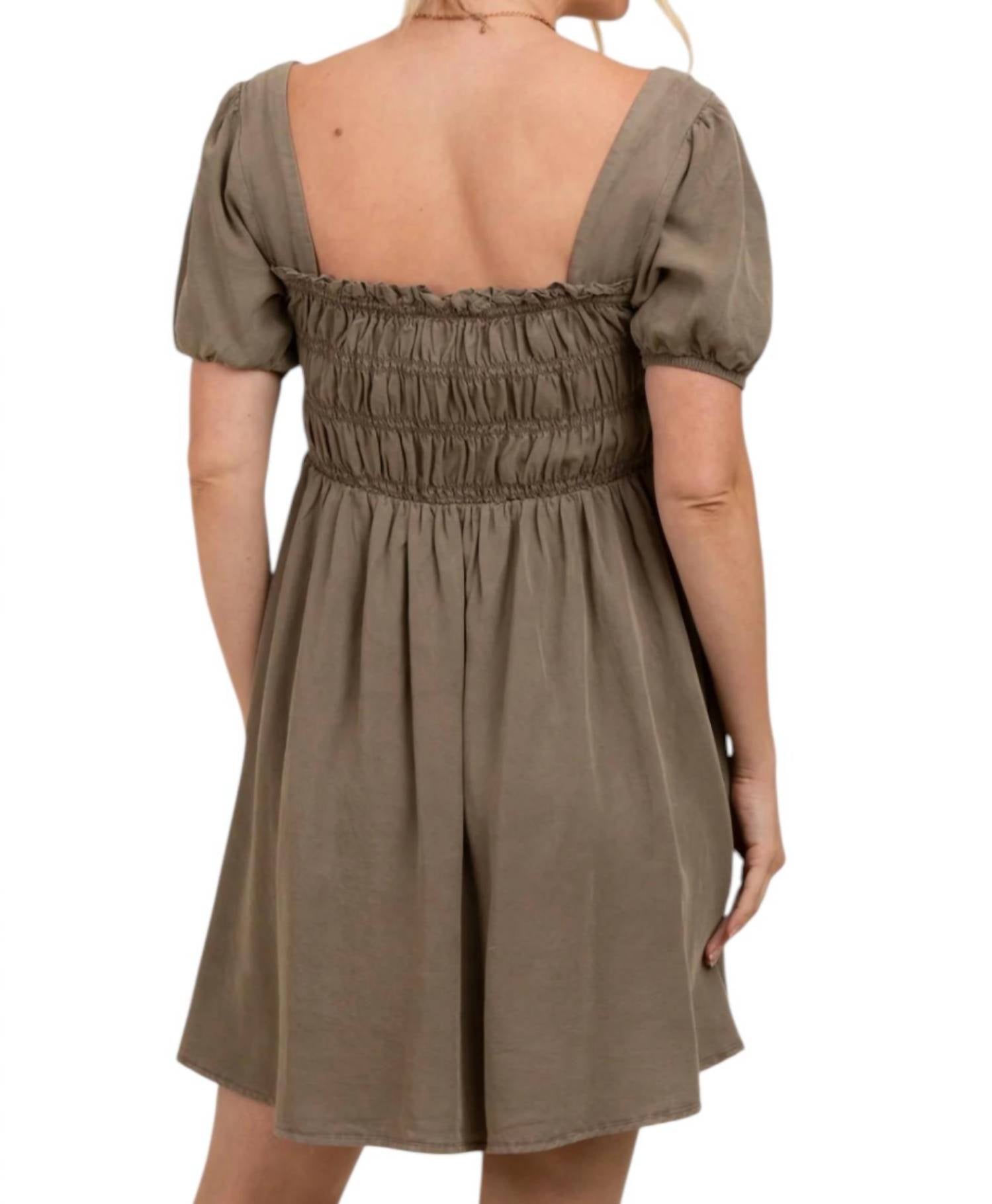 A short and breezy dress for those warmer days. Embrace a touch of nostalgia in chic Mocha, an ideal choice for 90s fashion enthusiasts. Features short puff sleeves and a stretchy smocked bodice, blending comfort with a flattering A-line silhouette. Composed of 100% Lyocell. Offers a breathable, airy feel, perfect for spring vacations and casual outings. Pull-on closure and square neckline add ease to its vintage-inspired charm. Best maintained with hand washing.