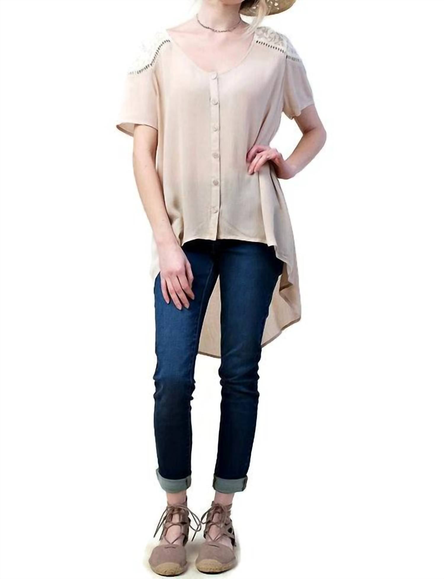 A versatile blouse that works from desk to dinner! The Lace Shoulder Blouse by KORI in elegant Mocha is an essential addition for any summer dinner party. This solid blouse features short sleeves, a scoop neck, and a button closure front, complemented by lace on the shoulders and back for a touch of quiet luxury. Crafted from 100% Rayon, it sports a high-low hemline with a back that is slightly longer, offering a relaxed A-line silhouette. Care instructions are simple: hand wash cold. Small bust measures 40" with a length of 24", while medium and large extend to a bust of 42" and 44", respectively, all with the same length. Imported for assured quality.