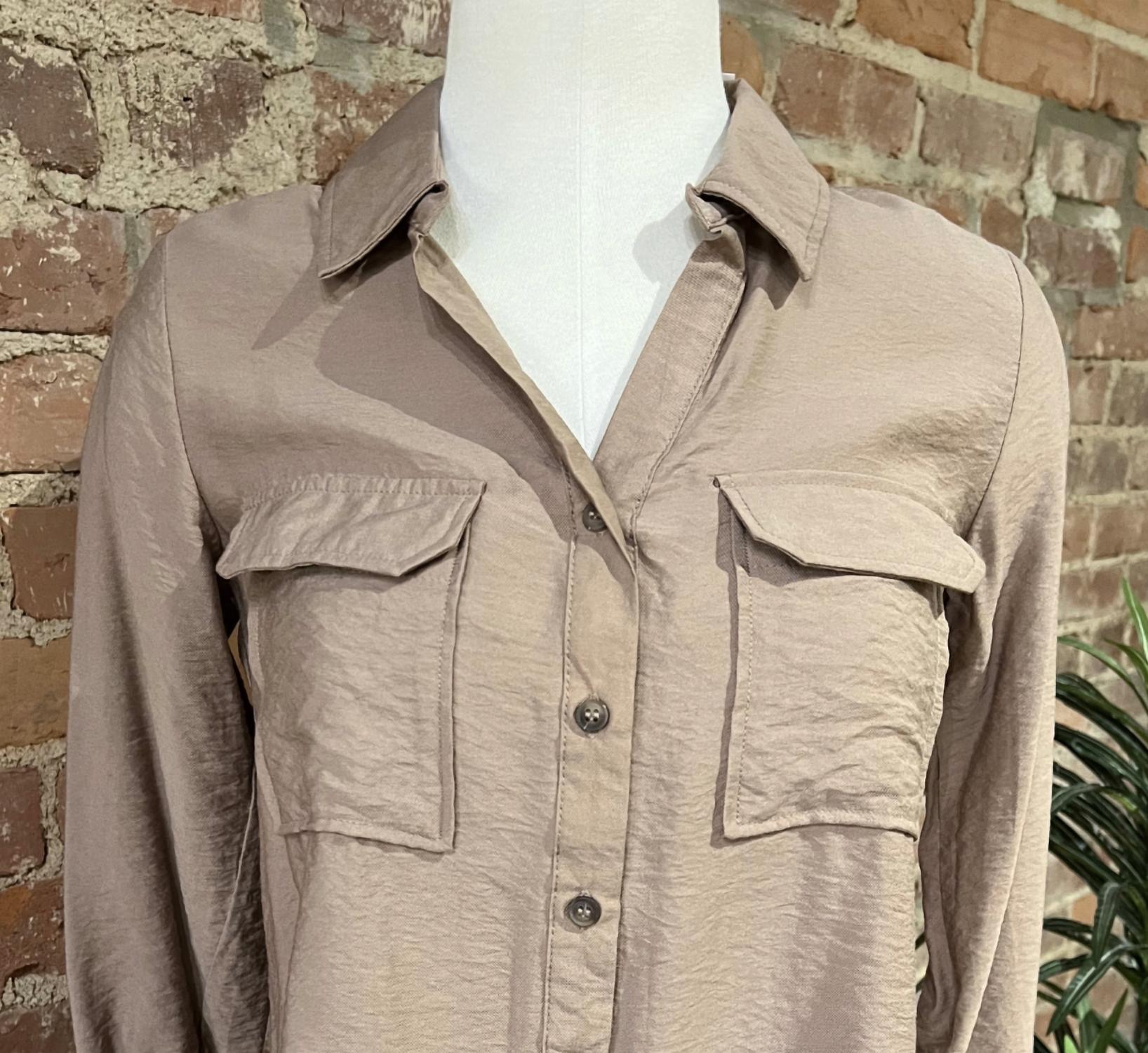 The perfect long sleeve tee that goes with just about anything. Elevate your wardrobe with The Workshop's Women's Button Down Shirt, a perfect addition for fall festivities. This mocha-toned shirt features long sleeves and a classic collar, ideal for both workwear and dinner parties. It includes practical pockets and a button closure for functionality. Make it your go-to piece for a sophisticated, solid look this Thanksgiving.