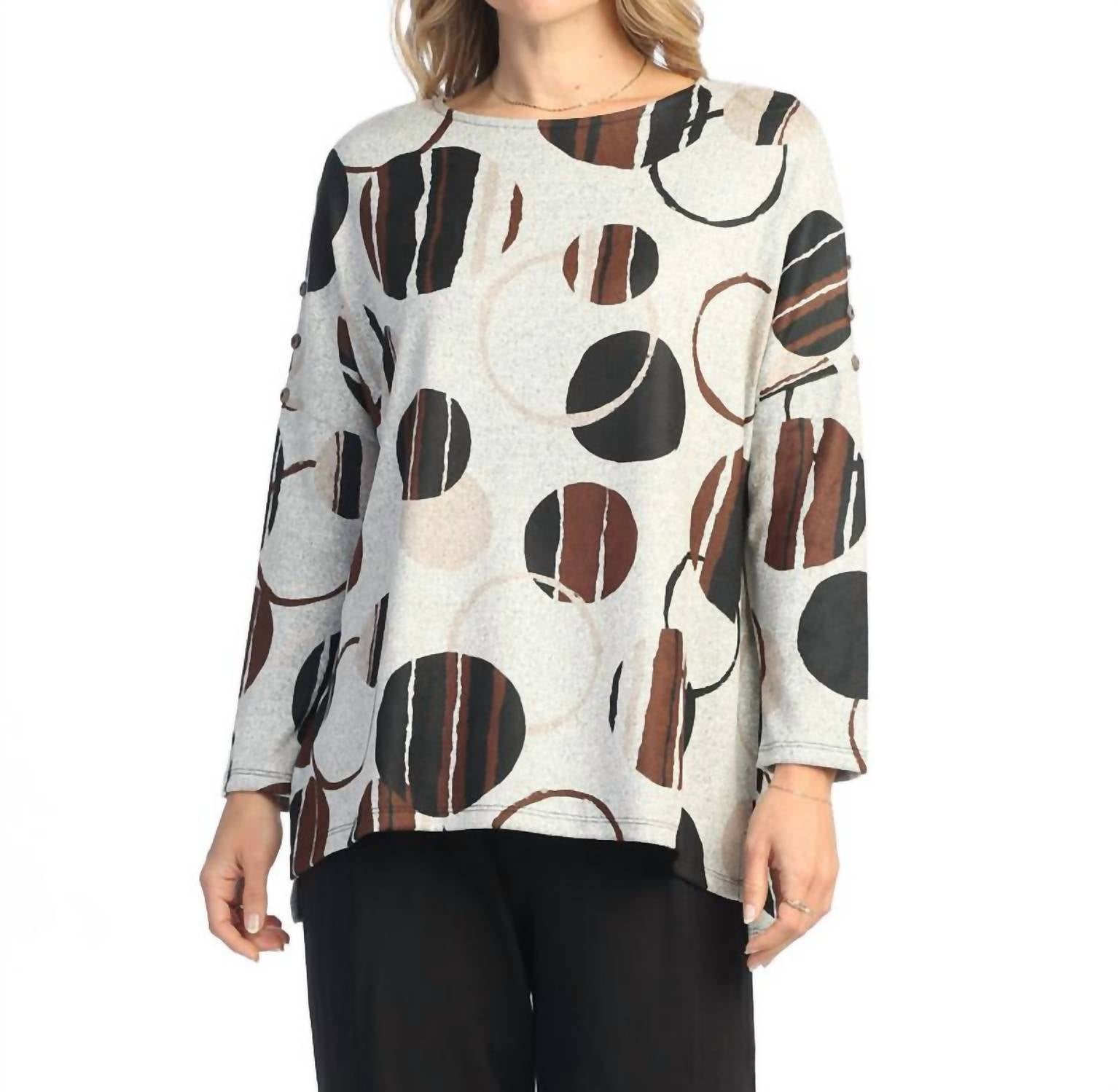 Discover the versatile charm of this tunic blouse, designed with both layering and standalone wear in mind. Its flattering silhouette and stylish details make it a closet essential. Discover the French Brushed Knit Safari Crewneck Tunic by Jess & Jane, a chic addition to your winter wardrobe in an elegant mocha shade. This long sleeve tunic is crafted from a lightweight knit blend of 96% polyester and 4% spandex, boasting shoulder button accents for a unique touch. Made in the USA with a pull-on closure, it offers effortless dressing ideal for vacation or Thanksgiving gatherings. Care is simple: just machine wash in cold water to maintain its patterned beauty.