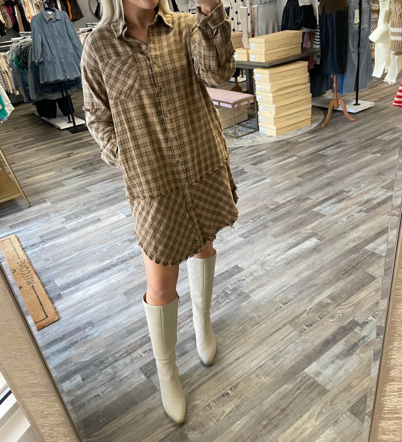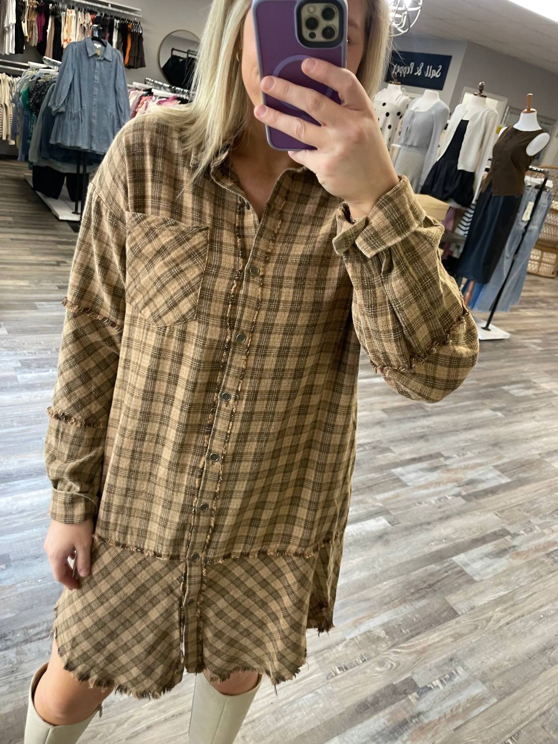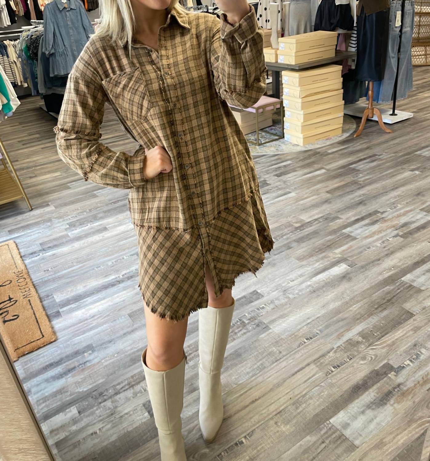 A short and breezy dress for those warmer days. Introducing the Oversized Plaid Dress by Heyson in a stylish mocha plaid pattern. This women's mini dress features long sleeves and a classic collar, designed with a flattering A-line silhouette. It includes practical pockets and secures with a button closure, offering both functionality and style for your wardrobe.