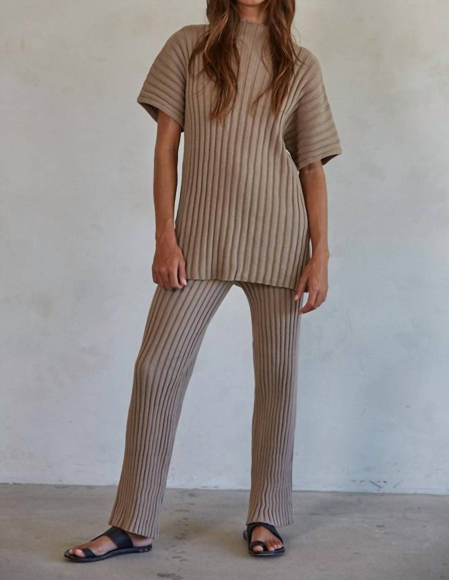 This straightleg pant is both stylish and comfortable. Did we mention the fit is perfection? Elevate your lounge game with the Cyndi Sweater Pants by By Together, perfect for errands or chillin' with friends. These straight leg pants in a delightful mocha color feature a relaxed fit and a high rise waist, offering a cozy and stylish look. Made from 100% cotton, these pants are designed with a pull-on closure for hassle-free wear. Perfectly textured for added flair, these pants lack pockets, ensuring a smooth silhouette.