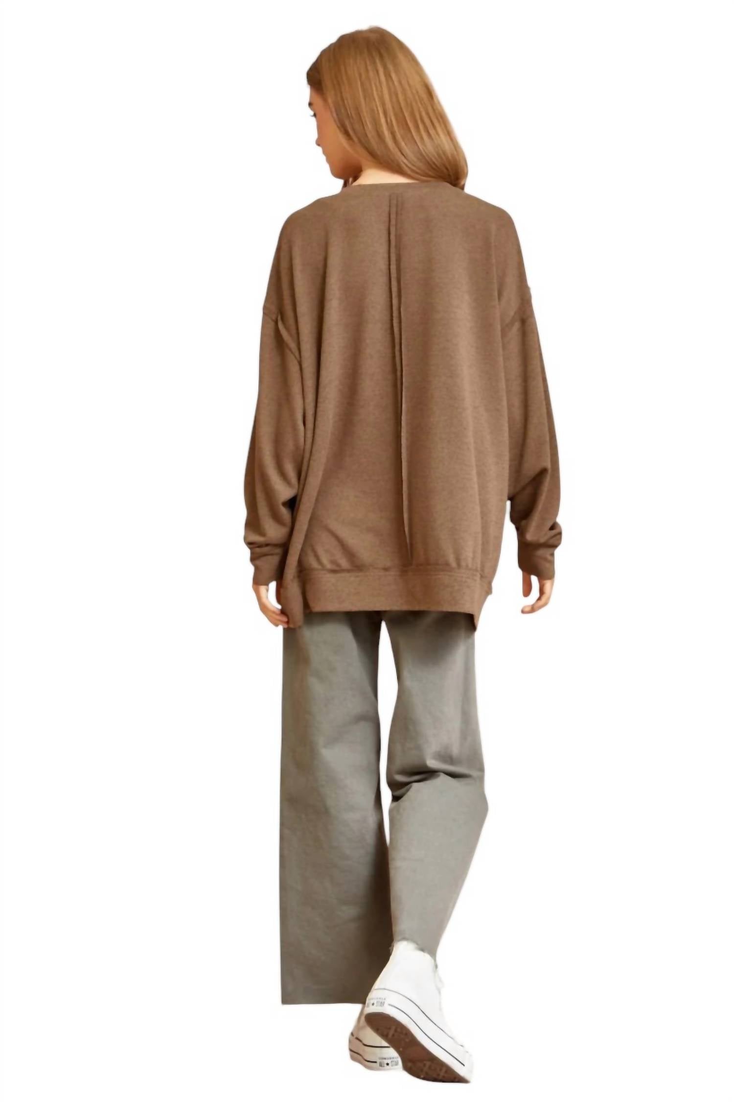 This hacci tunic top features a split neckline, raw edge details, and a banded hemline and sleeves. It has a slightly oversized fit with stretchy material for comfort. Made from 95% polyester and 5% spandex, it's a pull-on style.
