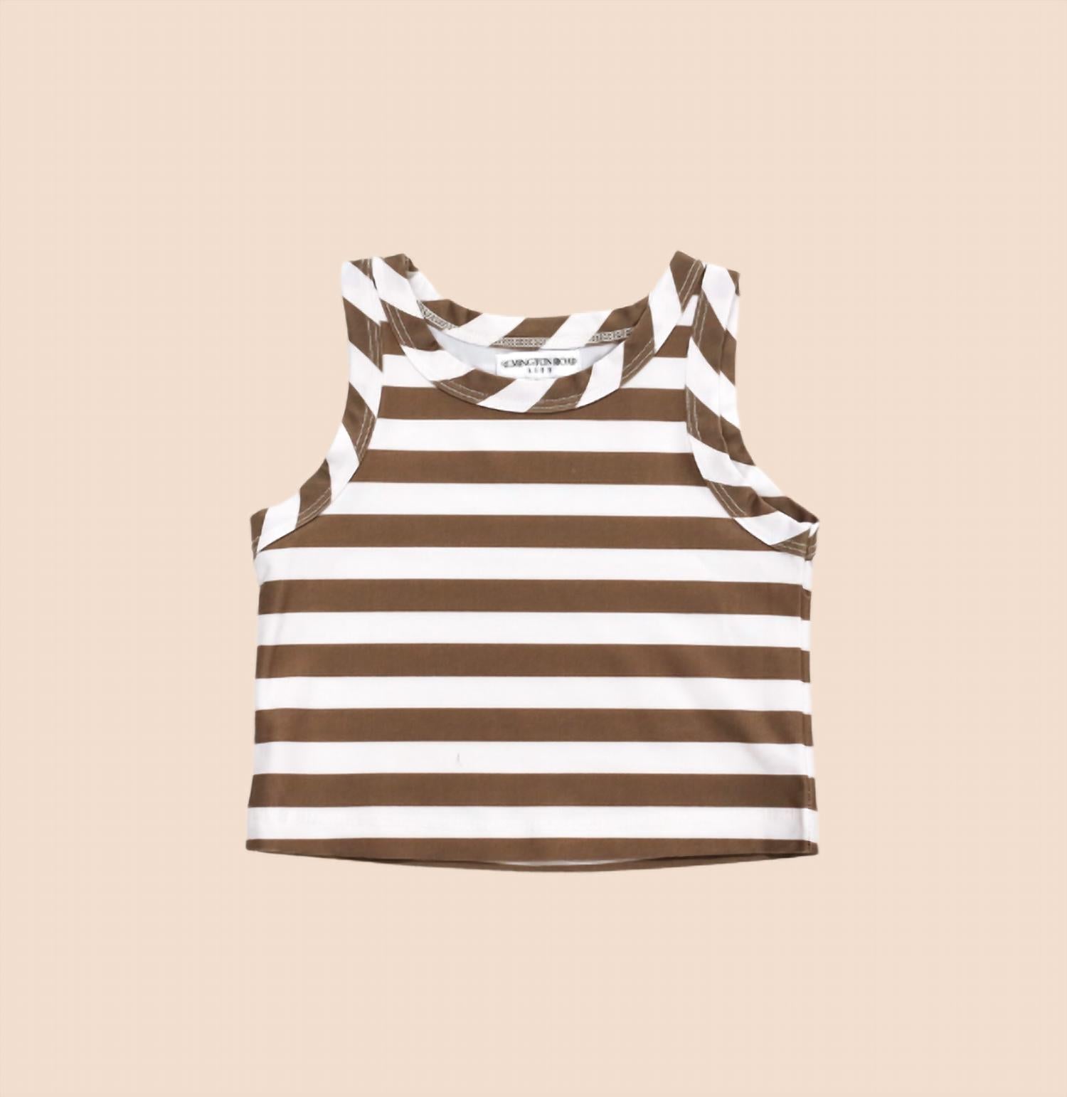 The perfect tank top for those warmer weather seasons. Introducing the Girls' Sporty Tank Top by Remington Road, a chic addition for effortless vacation wear. This sleeveless tank, featuring a classic mocha and white stripe pattern, offers a fitted silhouette with a round neckline. Composition: 65% Cotton, 35% Polyester. Closure: Pull-on. Care: Machine wash cold, gentle cycle, tumble dry low, medium iron. Perfect for a minimalist summer style.