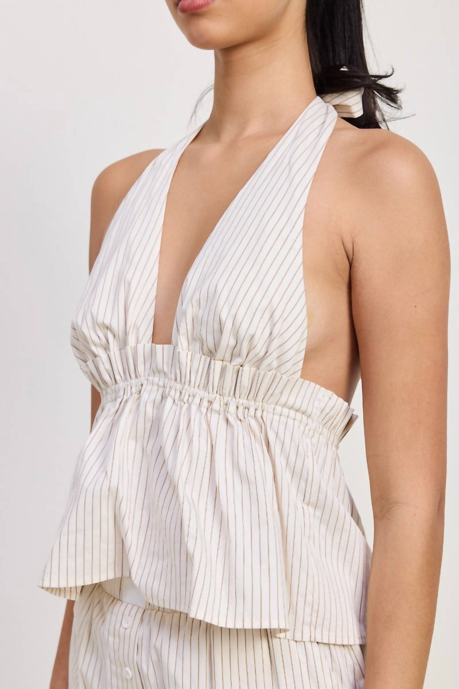 Pair this with your favorite jeans and slides for your next girls night out. Emory Park presents the Blair Halter Top, an ideal choice for summer with its playful style and versatile Cream Mocha Stripe design. This sleeveless top features ruffle detailing on the bust and a convenient tie closure, ensuring chic comfort. Made from a blend of 70% Cotton, 2% Nylon, and 3% Spandex, it offers a snug fit with elastic in the bust for added stretch. Imported for quality, care is made easy with machine wash instructions.