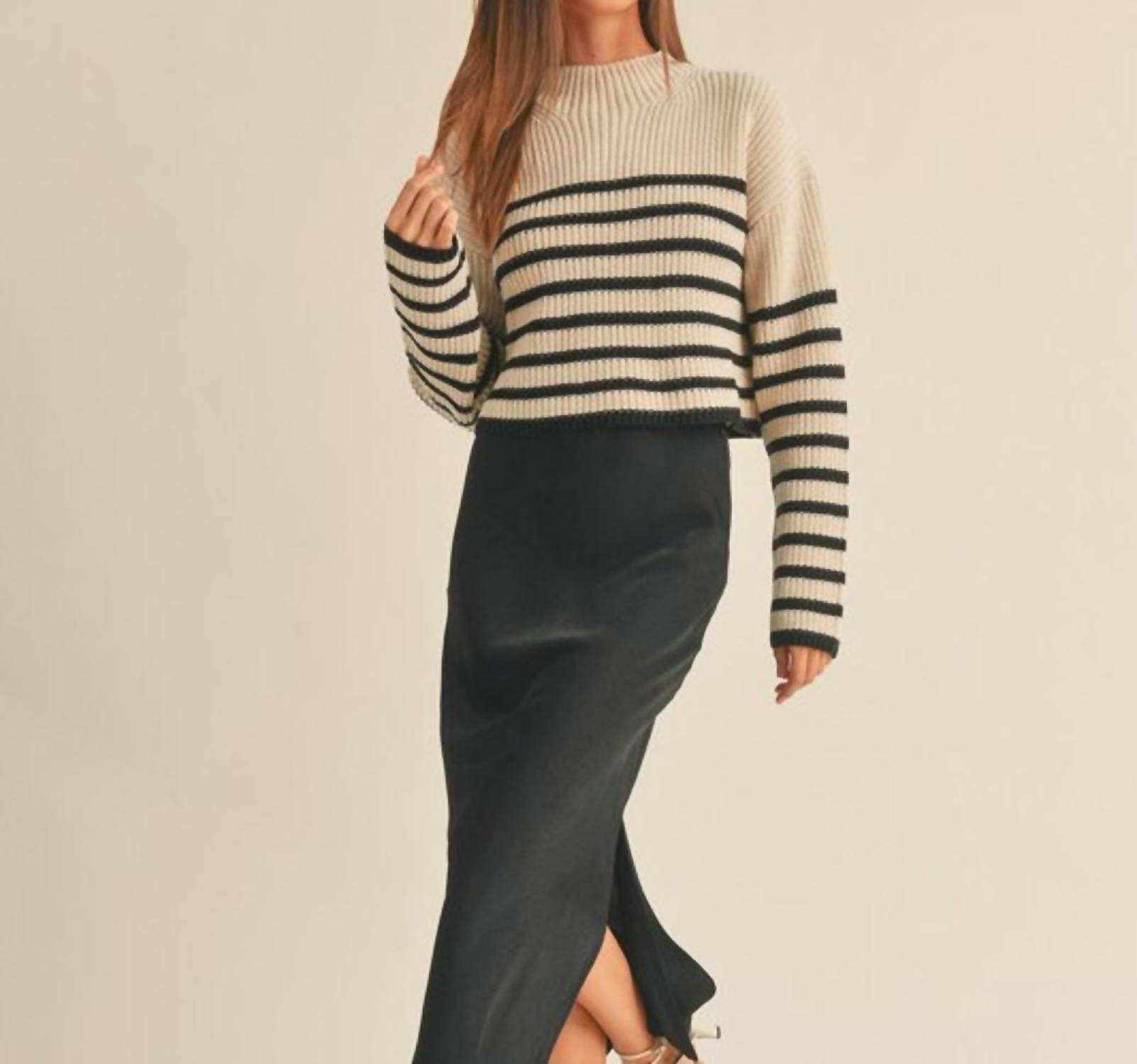 Throw this adorable cardigan over any cami or tank top. Introducing the Striped Pattern Sweater by MIOU MUSE, a chic addition to any autumn dinner party ensemble. With its long sleeves and cozy cotton blend, this women's cardigan features a flattering mockneck and a stylish mocha and black stripe pattern. Composition: 60% Cotton, 40% Acrylic. Closure: Pull-on style. Perfect for adding a touch of elegance to your fall wardrobe. Model is wearing size S.