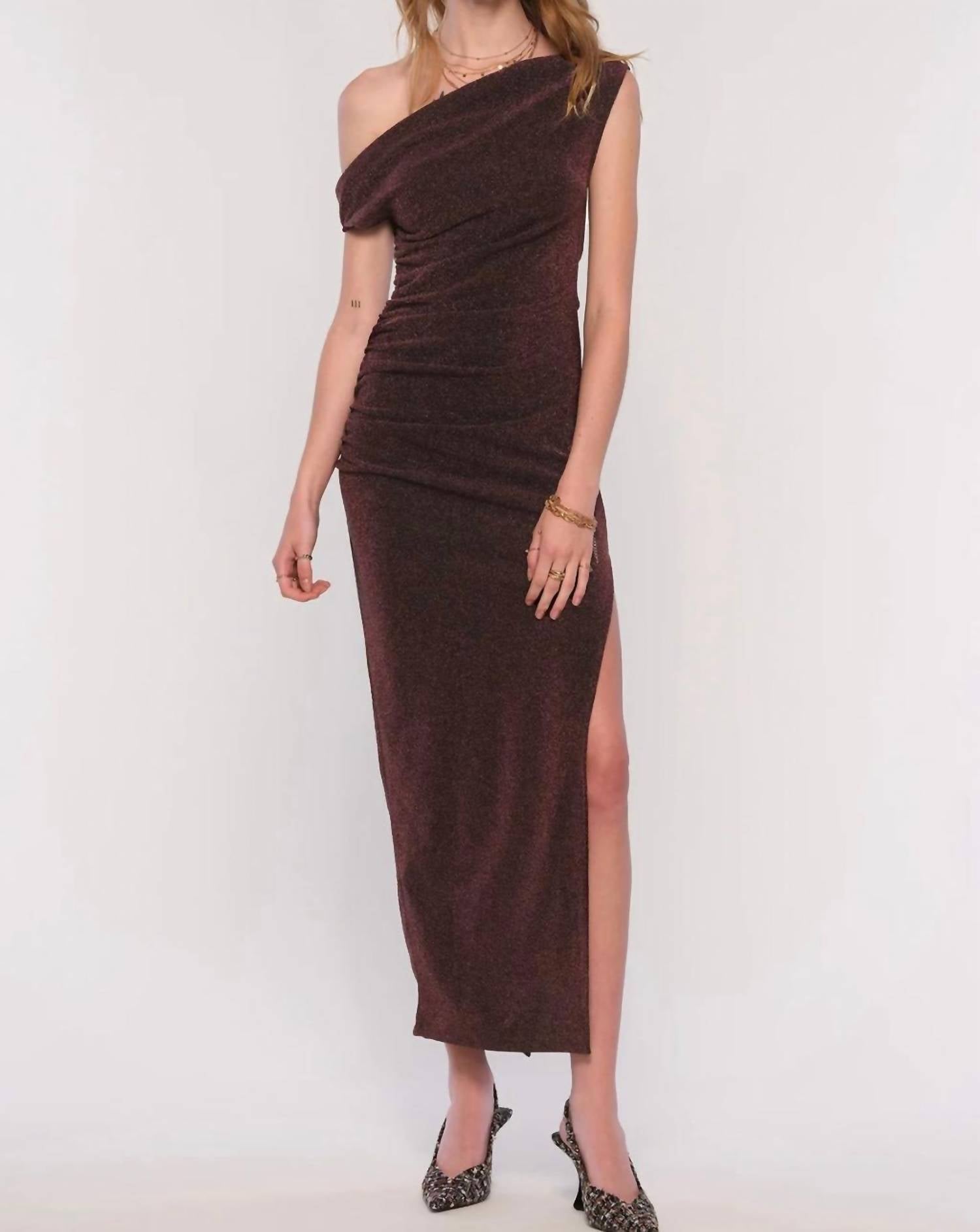 A maxi dress that is just as cute as it is comfortable. Step out in style with the Heartloom Jordie Maxi Dress, designed in a captivating Mocha hue. This sleeveless sheath dress is crafted from a shimmering knit with 60% polyester, 35% metallic thread, and 5% spandex, ensuring a slim fit with flattering shirring at the sideseam. The off-the-shoulder neckline and side slit elevate its allure, while the pull-on closure offers ease of wear. Measuring 52" from the high point of the shoulder, this maxi dress is machine washable, perfect for spring dinner parties and New Year's Eve celebrations.