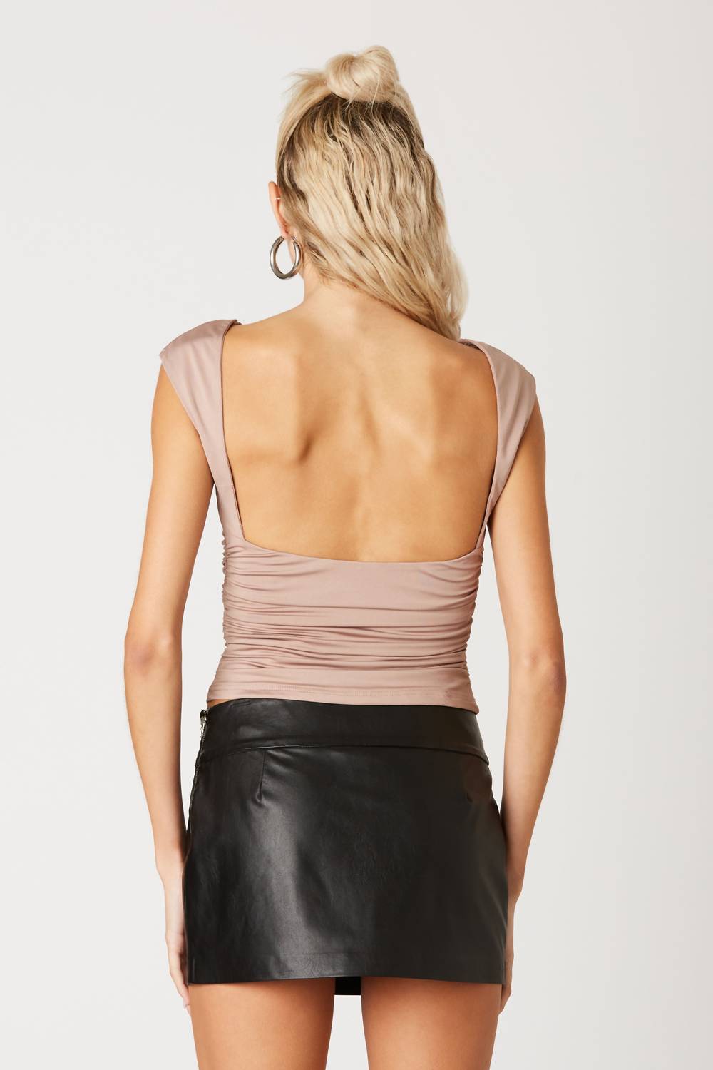 Show a little skin in this cute and casual crop top. This is a slightly ruched tank top with a low cut-out back. It is made of 95% polyester and 5% spandex. The model shown is wearing a size small.
