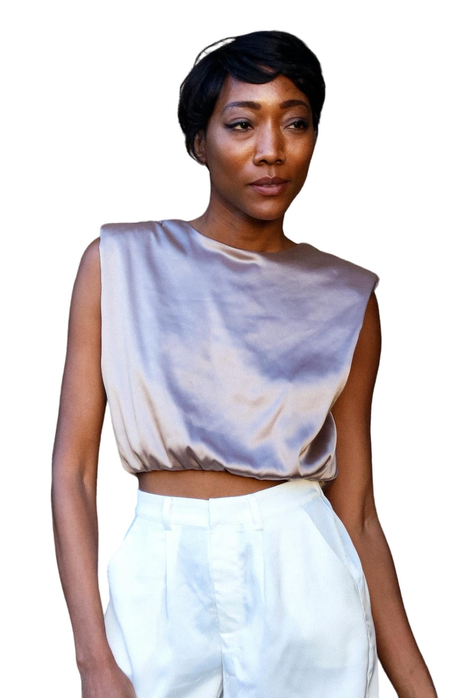 Silk Top with Shoulder Pads. Trendy and versatile. Suitable for any occasion.