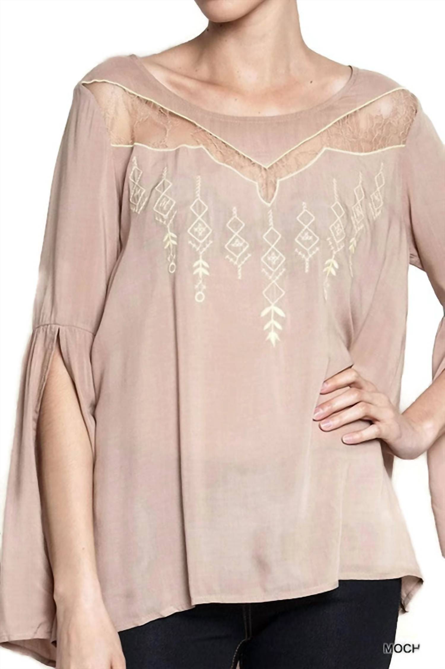 A timeless blouse that will never go out of style. Crafted for a chic and bohemian-inspired look. Features three-quarter angel sleeves with beautifully embroidered tribal print and lace detailing at the scoop neckline. Made from 100% Rayon. Offers a relaxed A-line silhouette with a garment length of 27 inches. Designed with a convenient pull-on closure. Embraces both style and comfort.