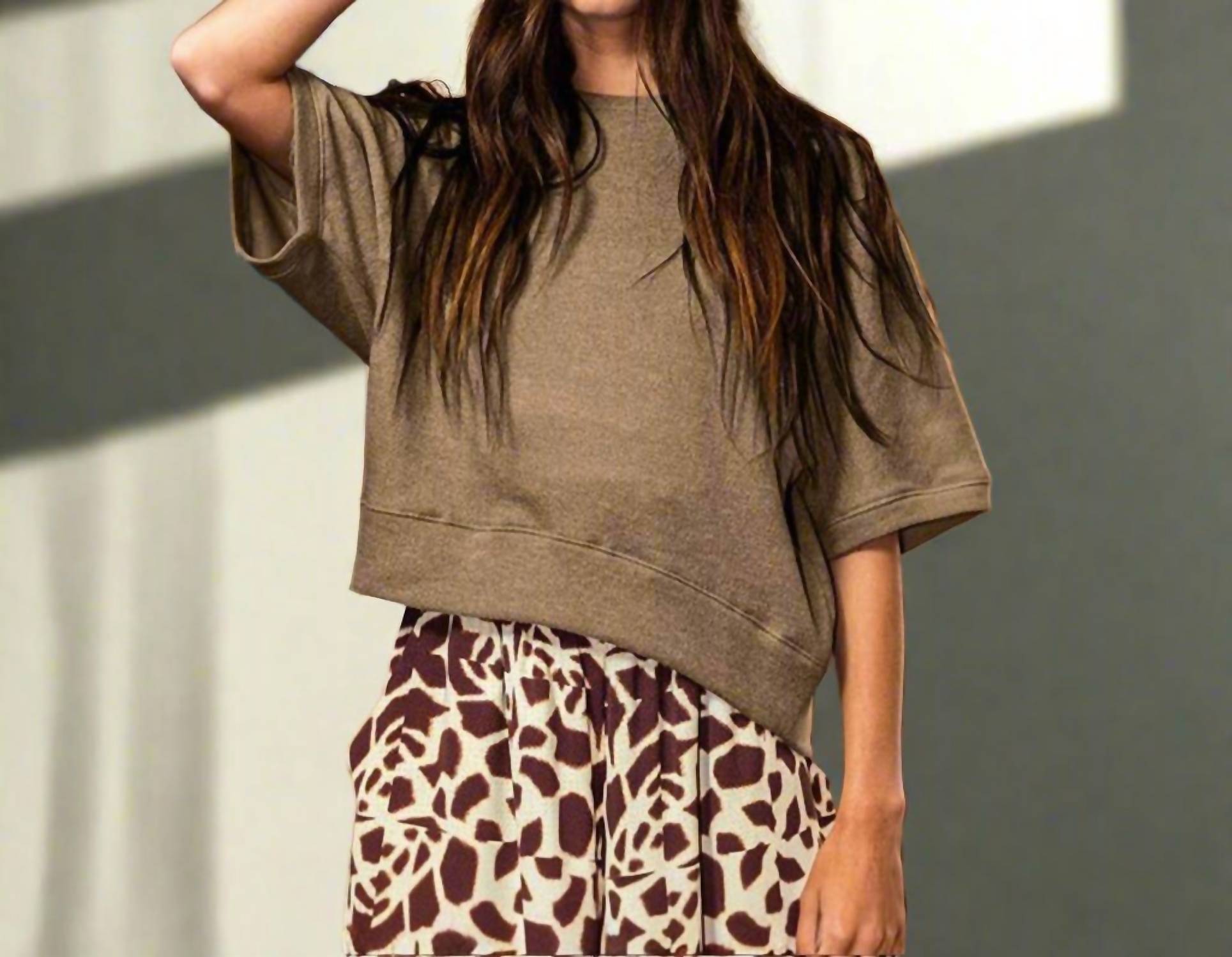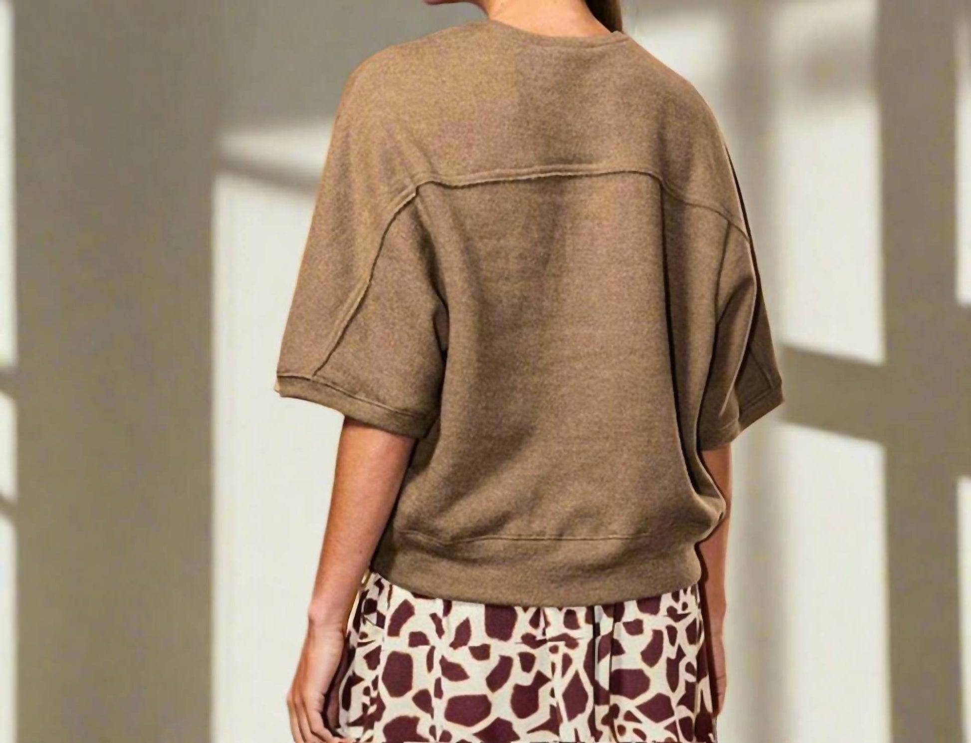 Cozy fabric, impeccable design - Meet the sweatshirt that you'll never want to take off. Elevate your casual wardrobe with the Kimmy Short Sleeve Sweatshirt by BUCKETLIST, a chic addition in Light Mocha. Made from a blend of 60% Polyester, 35% Rayon, and 5% Spandex, this solid piece boasts a tailored cropped fit with raw edge accents for a modern touch. The short sleeves and classic crew neckline enhance its versatility for spring occasions. With a convenient pull-on style, this minimalist sweatshirt is perfect for a vacation, and it is machine washable for easy care.