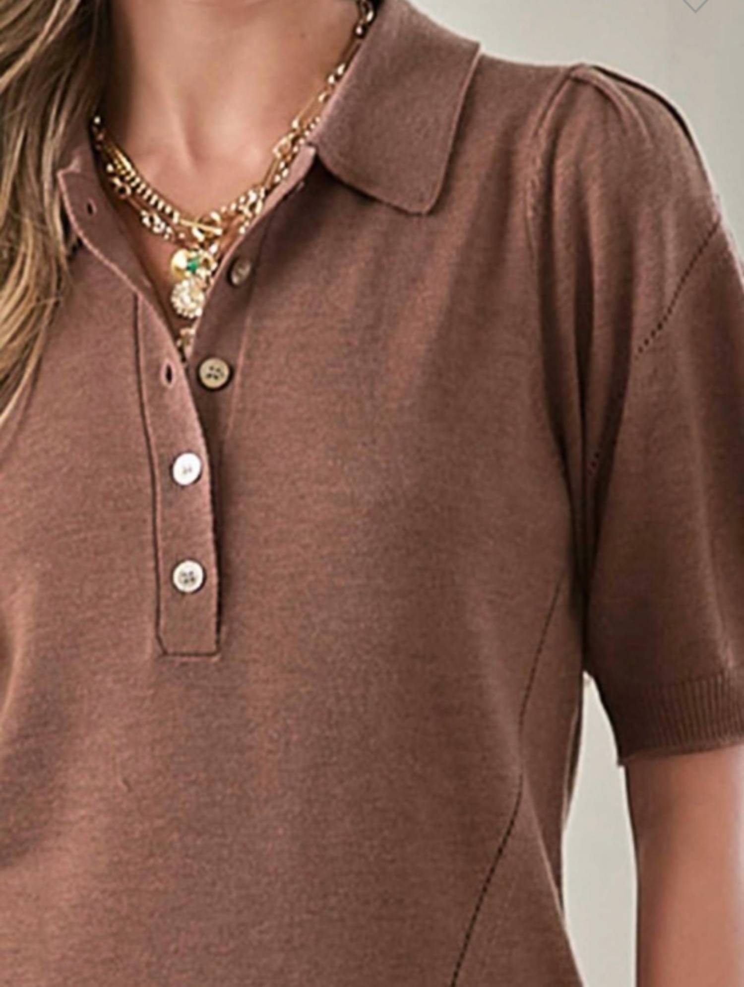 A versatile blouse that works from desk to dinner! Introducing the Ribbed Polo Knit Top by Current Air in a sophisticated mocha hue, perfect for your fall wardrobe. This minimalist, short sleeve blouse features a classic collar neckline, ideal for a dinner party or holiday gathering. Made from a soft blend of 54% polyester, 20% acrylic, 20% nylon, and 6% wool, it offers comfort and style in a solid pattern. Easy to wear with a pull-on closure, this top is designed for women who appreciate simplicity and elegance.