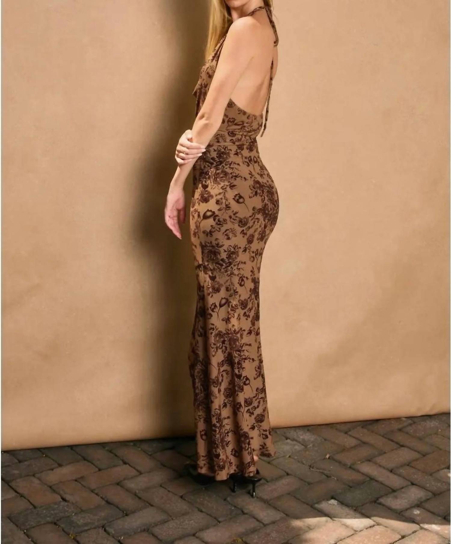A maxi dress that is just as cute as it is comfortable. Introducing the Draped Halter Neck Maxi Dress by DRESS FORUM, an elegant choice for any dinner party or special occasion. This women's sleeveless dress in a mocha floral pattern offers a flattering bodycon silhouette with a soft cowl neckline and ruching details. Closure type: Pull on. Care: Dry clean only.