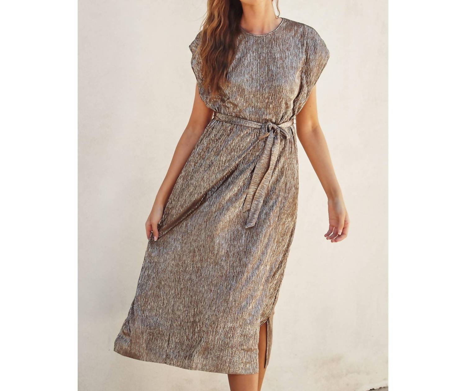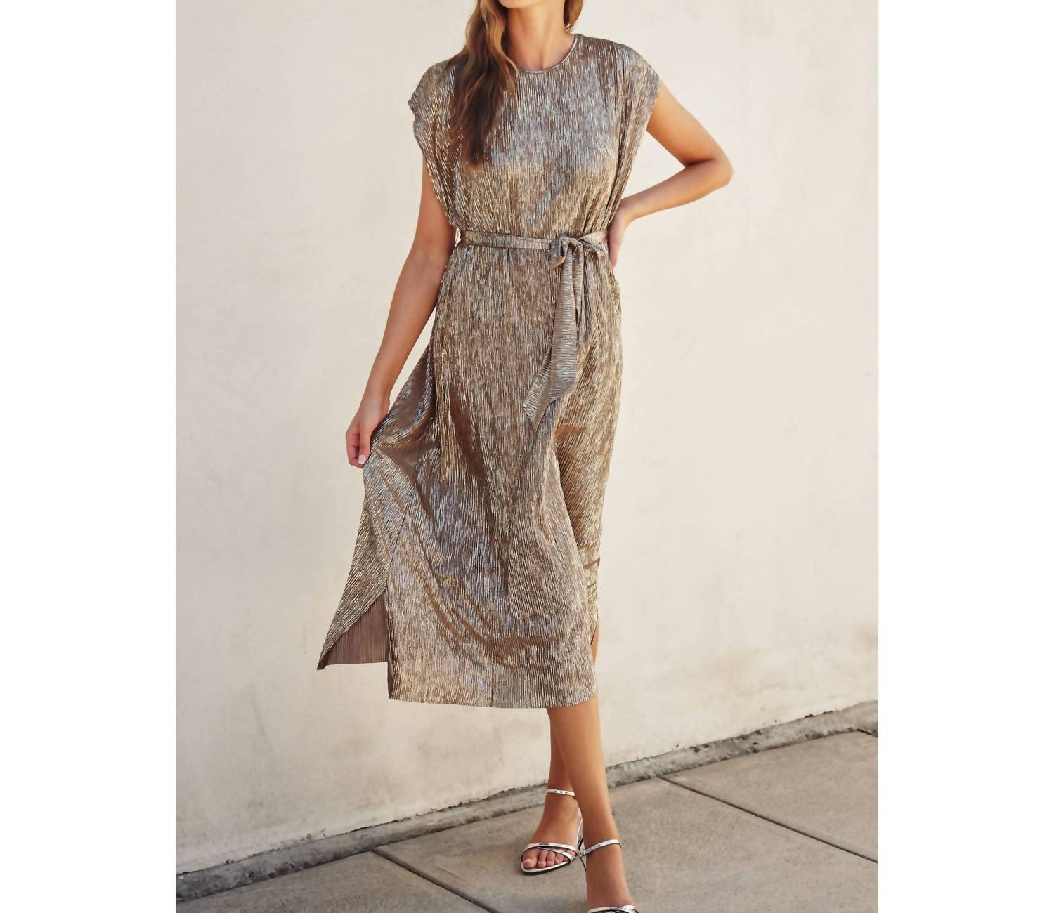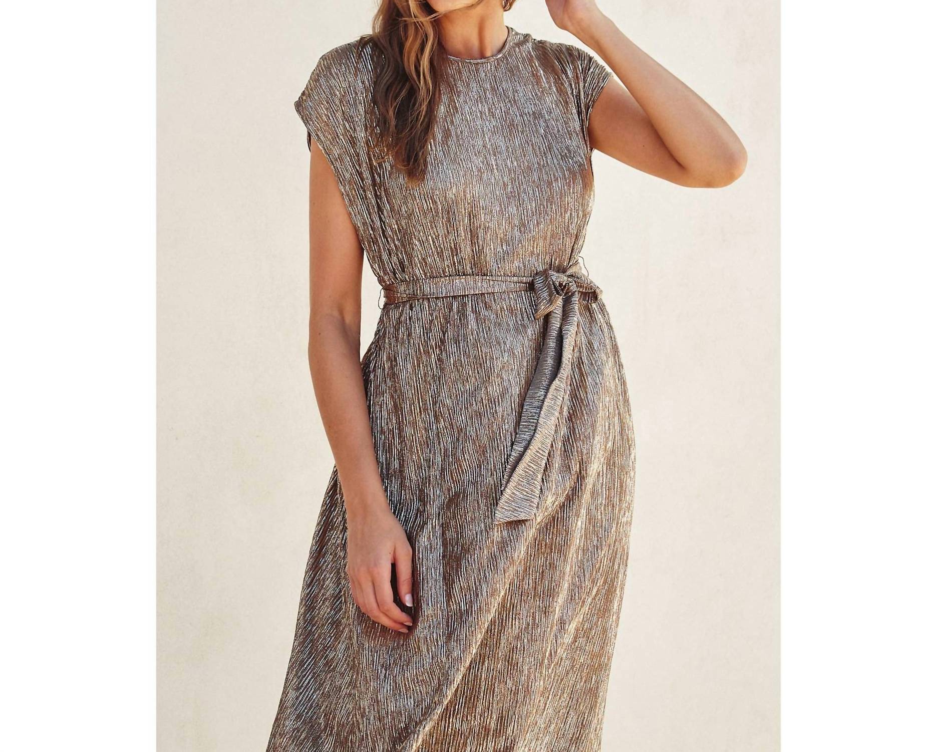 A maxi dress that is just as cute as it is comfortable. Make a statement at any spring wedding with the DRESS FORUM Gold Foiled Cap Sleeve Maxi Dress. This elegant piece features cap sleeves and a flattering crew neck, while a sash belt and side slit detail add a touch of sophistication to its sheath silhouette. Crafted from shimmering textured polyester, its mocha gold hue ensures you'll shine all night. Unlined and pocket-free, it arrives in just 1-3 business days for your convenience. Model is 5'10" and wearing size Small.