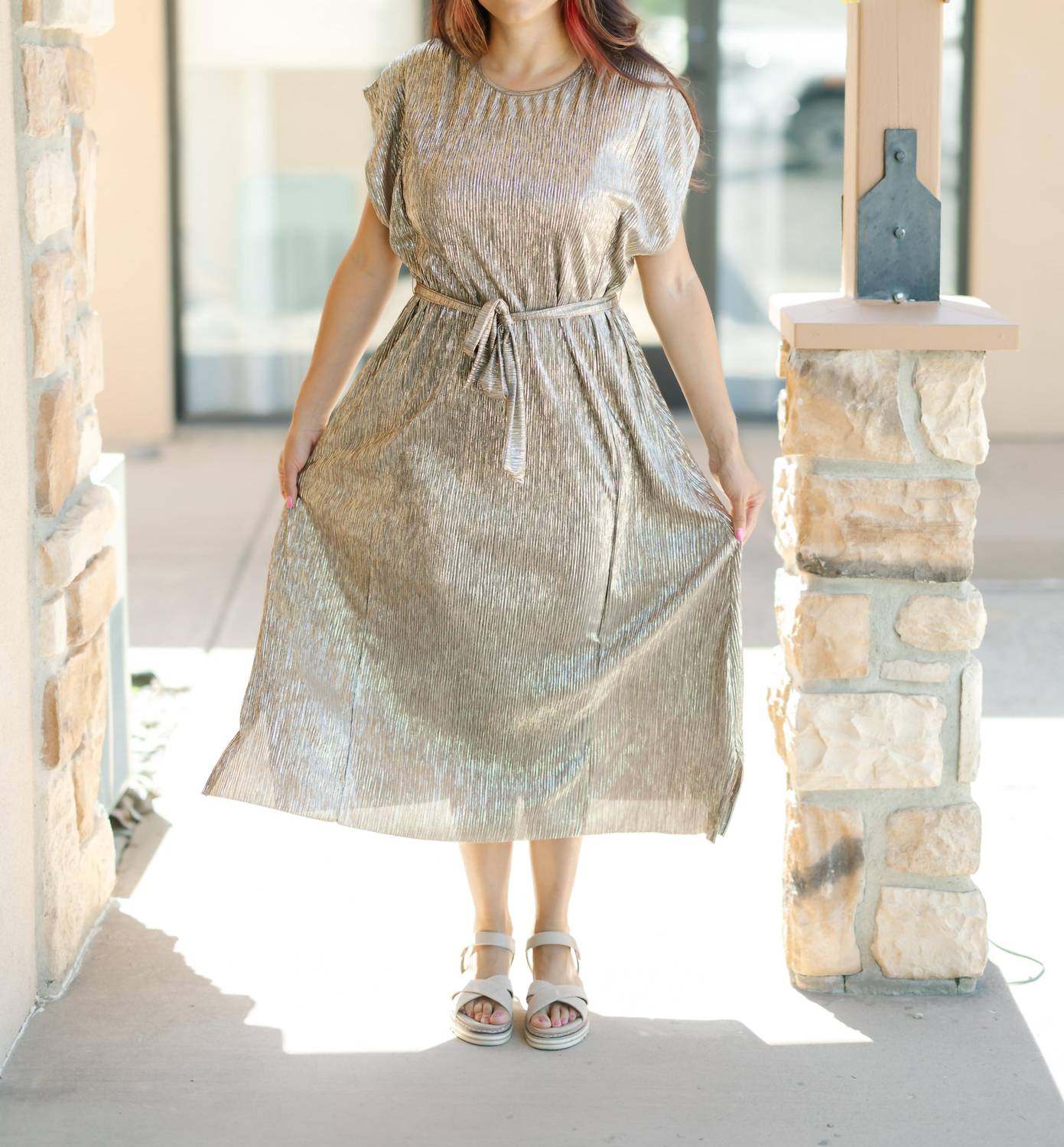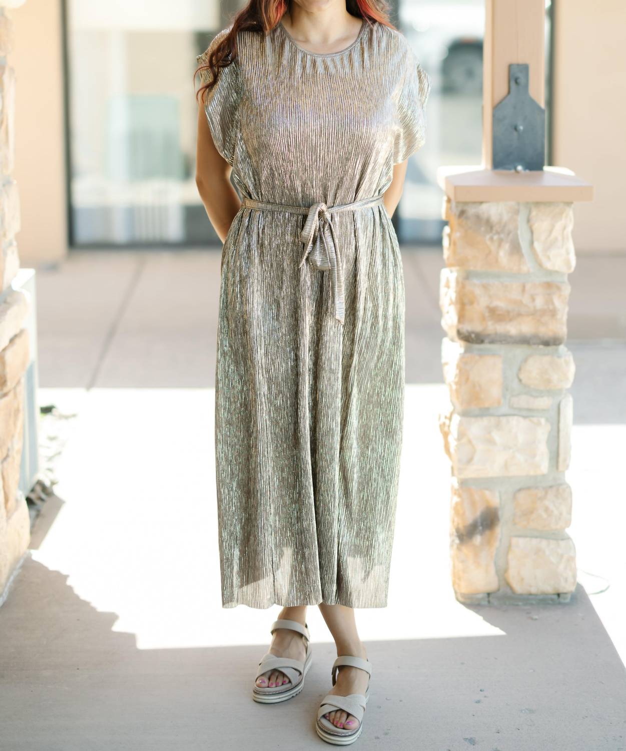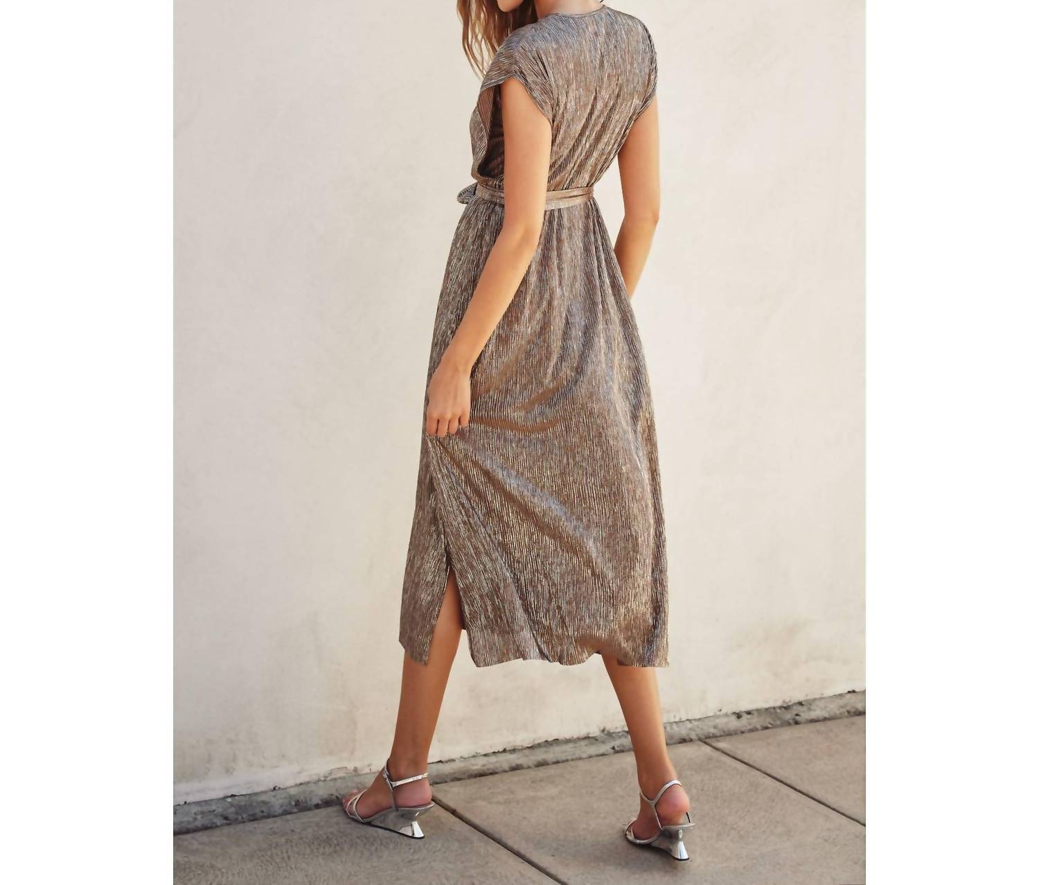 A maxi dress that is just as cute as it is comfortable. Make a statement at any spring wedding with the DRESS FORUM Gold Foiled Cap Sleeve Maxi Dress. This elegant piece features cap sleeves and a flattering crew neck, while a sash belt and side slit detail add a touch of sophistication to its sheath silhouette. Crafted from shimmering textured polyester, its mocha gold hue ensures you'll shine all night. Unlined and pocket-free, it arrives in just 1-3 business days for your convenience. Model is 5'10" and wearing size Small.
