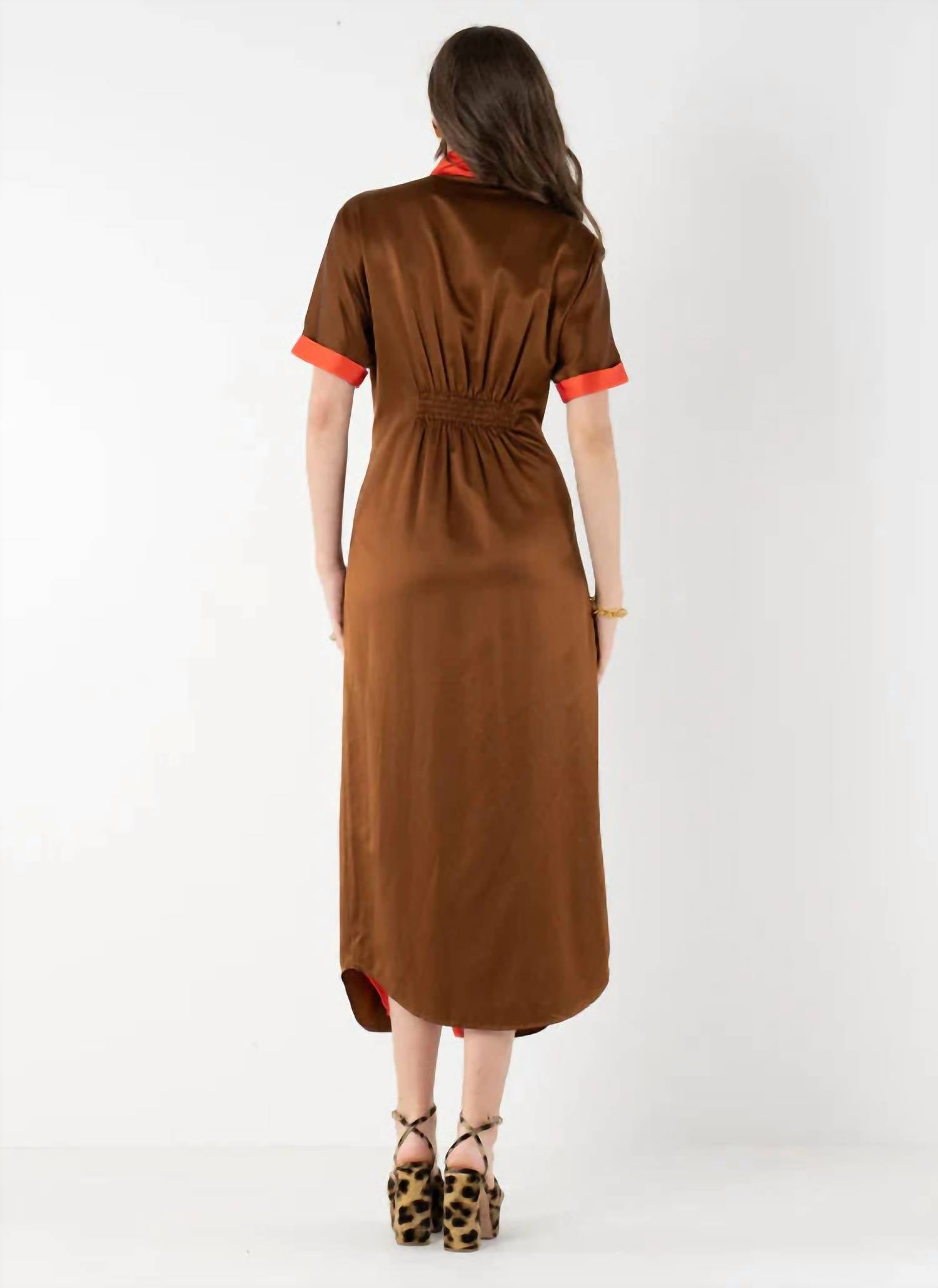 A midi dress so versatile, your options for wearing it are endless. Introducing the Georgia Midi Dress by Emily McCarthy, a perfect blend of sophistication and seasonal flair in a lustrous mocha hue. This stunning midi dress features chic short dolman sleeves and a classic stand collar, beautifully complemented by a gold button front closure that enhances its tailored silhouette. Crafted from a luxurious blend of 59% silk and 41% cotton with a 100% polyester lining, it promises elegance and comfort. Care: Hand wash with gentle liquid or powder detergent, use cold water to preserve color and shape, and hang dry.