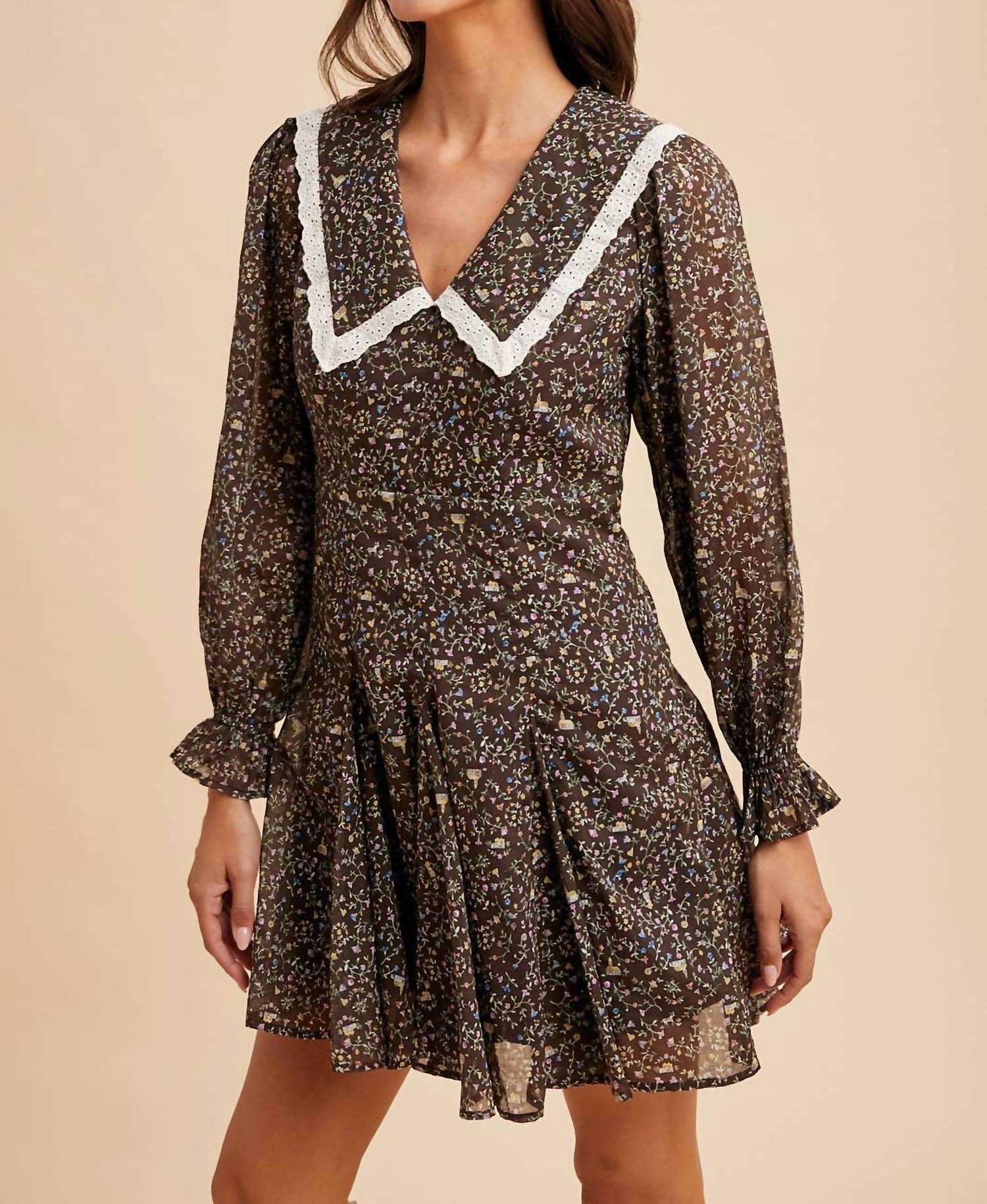 The perfect mini dress for those warmer months. Introducing the Peter Pan Collar Flared Mini Dress by IN-LOOM, a charming piece in mocha designed to captivate with its Boho Chic style. This mini dress features a long sleeve design and is adorned with a delicate ditsy floral print and scalloped eyelet trim. Its fit and flare silhouette and flared circle skirt offer a flattering shape, complete with a side zip closure and self ribbon tie. Ideal for a fall dinner party, this dress combines elegance with playful charm.
