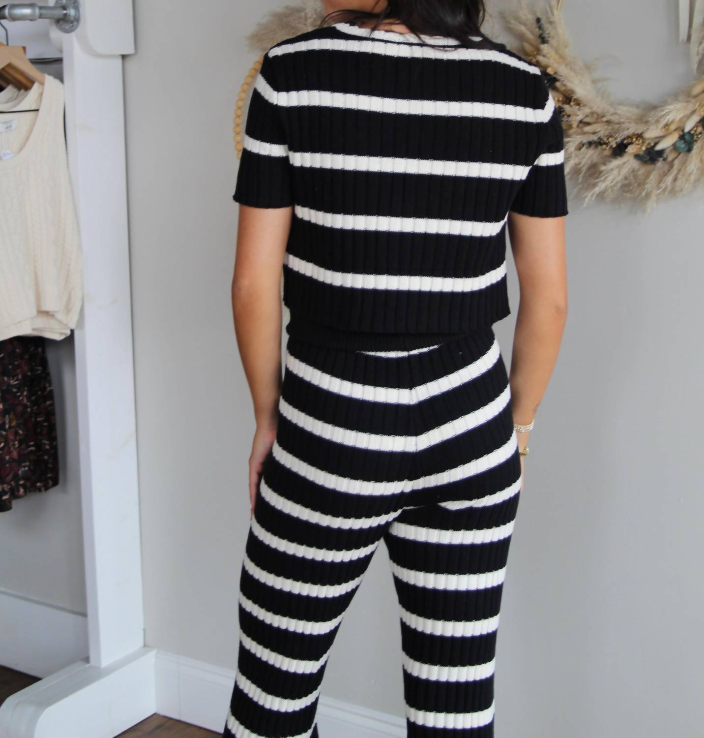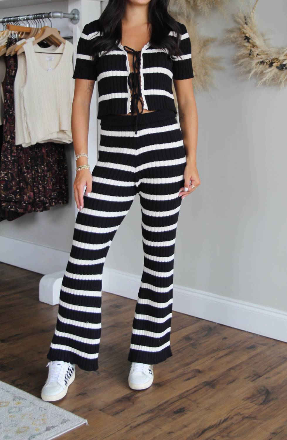 Introducing the Mocha Striped Pants by MABLE, the epitome of style and comfort in chic black and white. These women's pants feature a flattering high drawstring waist and a relaxed wide leg fit, ensuring both style and ease. With a pull-on closure, these striped crochet pants are designed for effortless wear. Ideal for casual days, they offer a perfect blend of comfort fit without any pockets for a sleek silhouette.