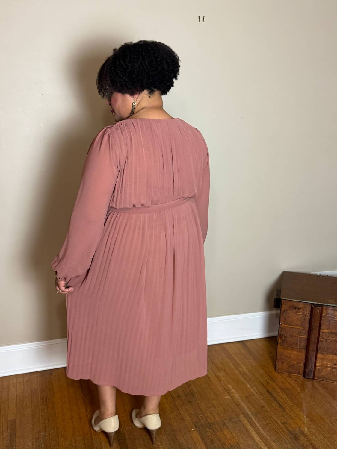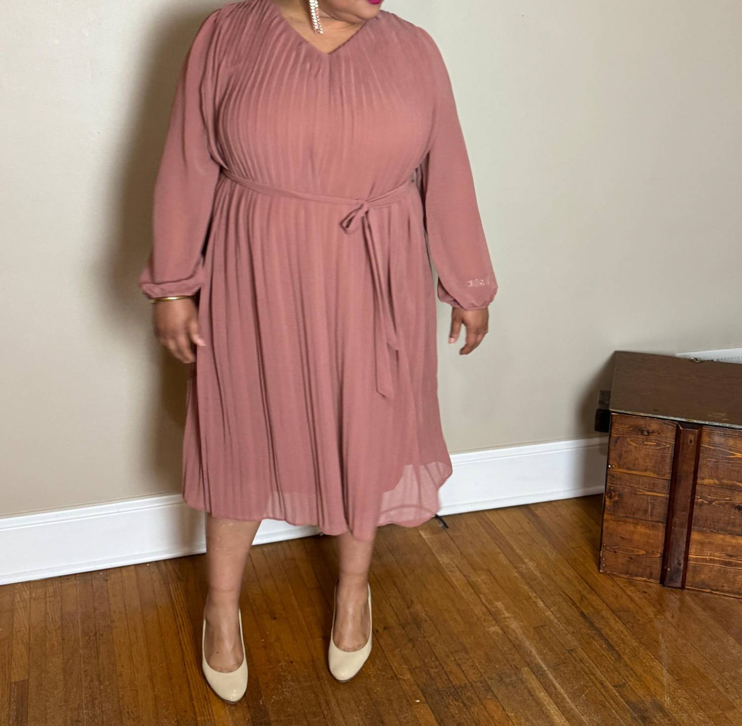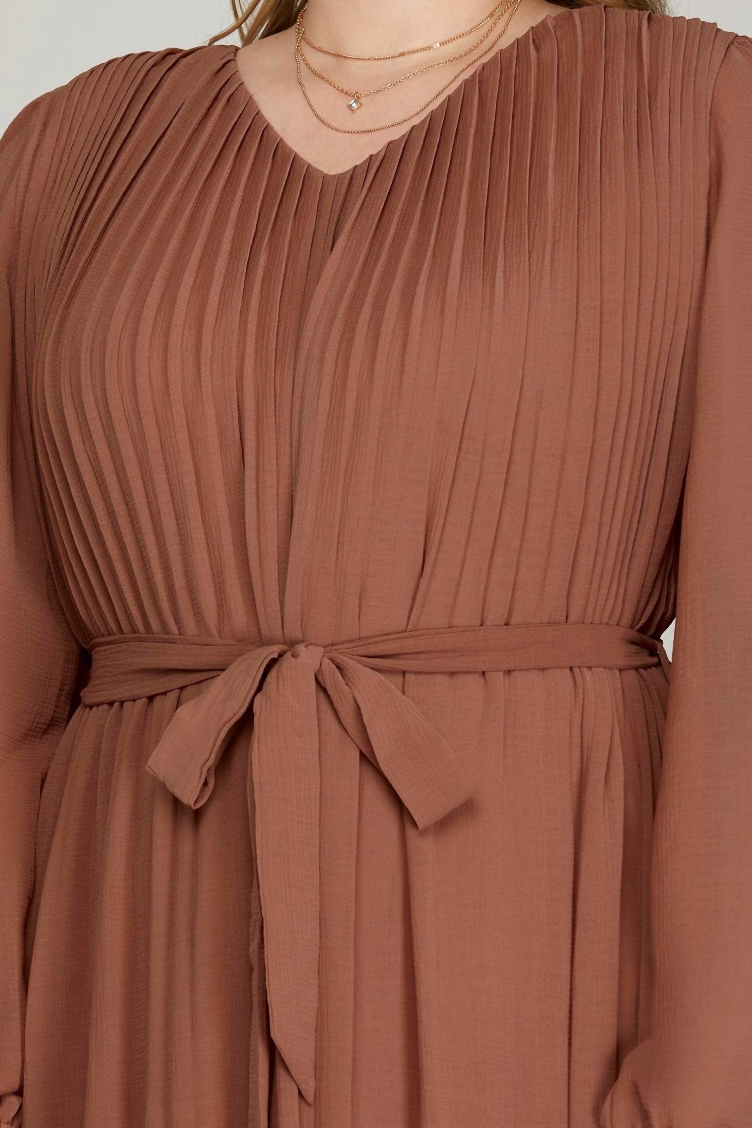 The pefect long sleeve dress for those cooler months. Step into effortless elegance with our Pleated Chiffon Midi Dress, designed for the modern woman who values both style and comfort. Featuring soft pleats, a flattering V-neckline, and a self-tie waist, this dress enhances your silhouette while providing a relaxed, flowy fit. The long sheer sleeves with elastic cuffs add a touch of sophistication, making it perfect for weddings, brunches, special occasions, or elegant everyday wear.