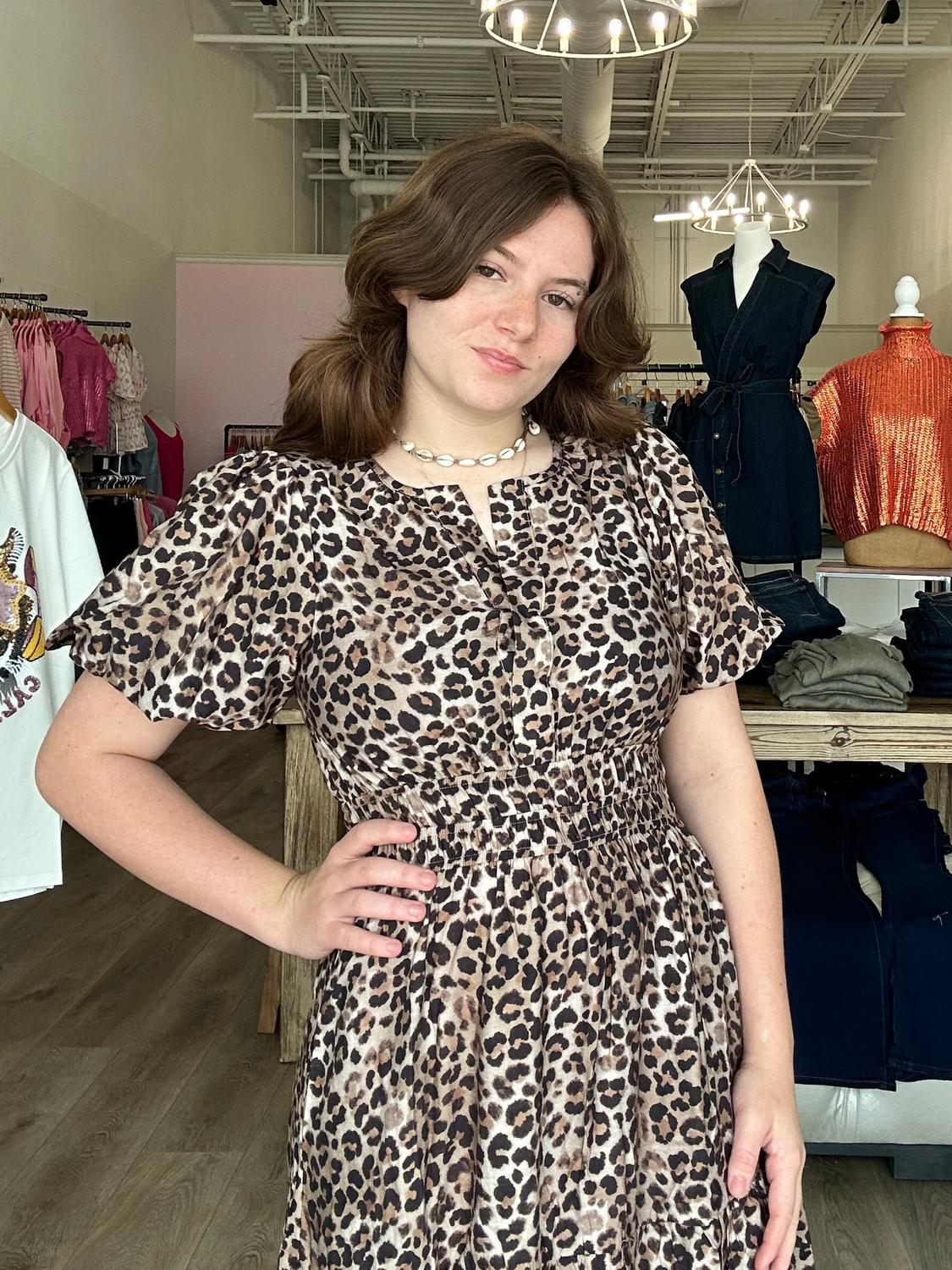 She + Sky - Short Puff Sleeve Woven Leopard Tiered Midi Dress
