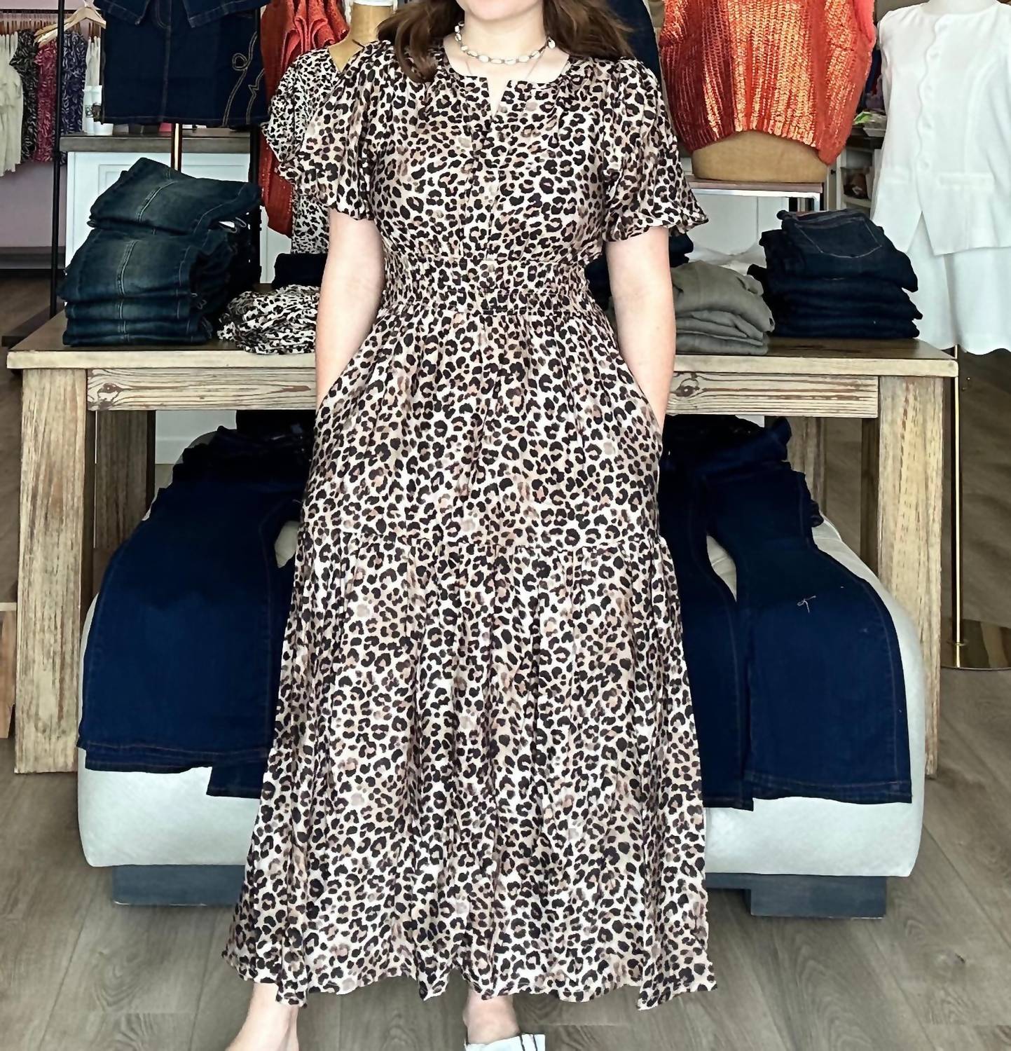A midi dress so versatile, your options for wearing it are endless. Introducing the Short Puff Sleeve Woven Leopard Tiered Midi Dress by SHE + SKY, perfect for making a statement at your next holiday party. This women's dress in a chic mocha color boasts a trendy animal print and a flattering fit-and-flare silhouette. Crafted from cotton, it features short puff sleeves, a comfortable elastic waist, and handy pockets. Designed with a pull-on closure and a crewneck, this timeless piece is ideal for a boho chic look this Thanksgiving.
