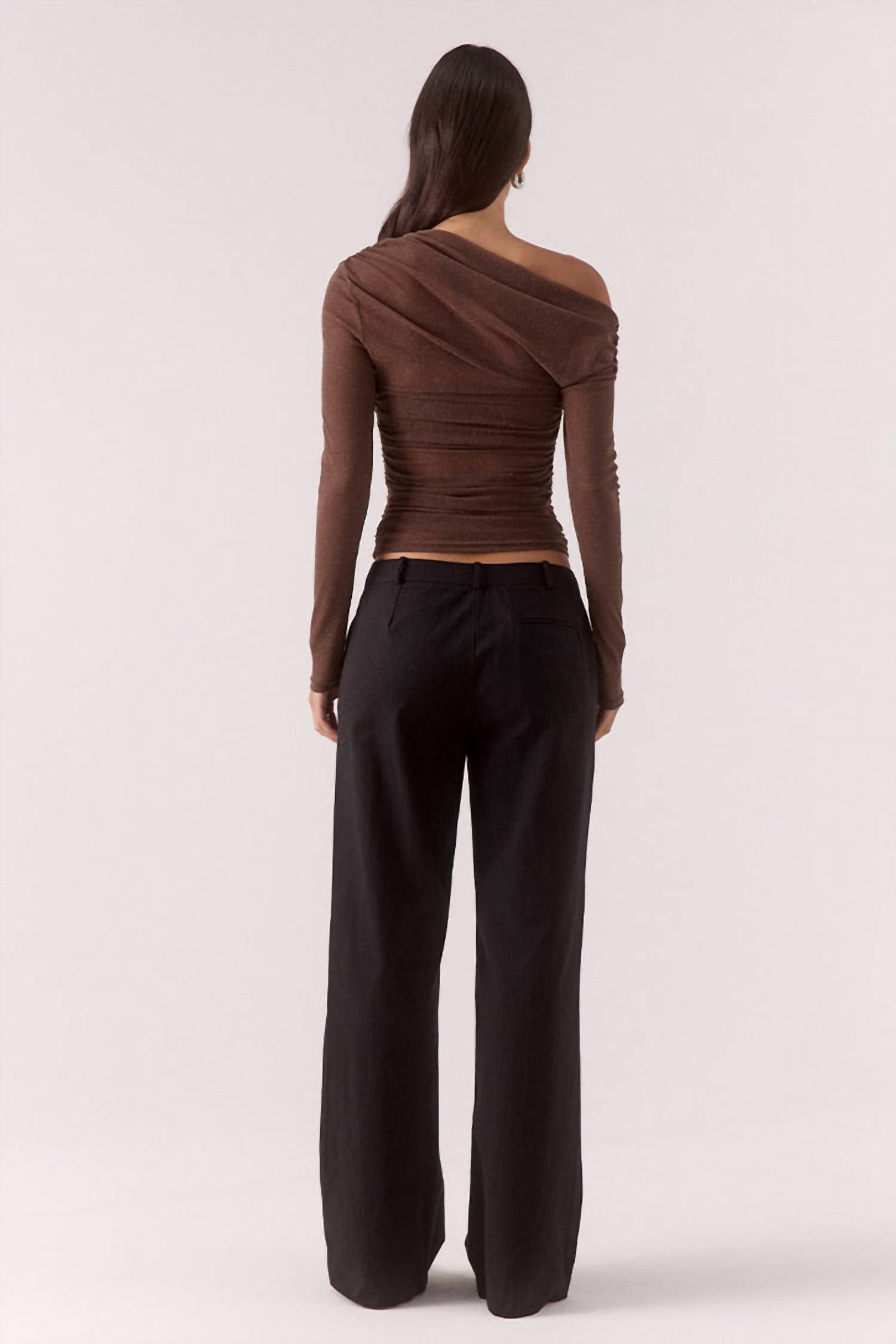 A timeless blouse that will never go out of style. Introducing the Zeya Long Sleeve Top by SOVERE in an alluring Mocha hue, perfect for your next cocktail party. Designed with a fitted off-shoulder, sheer look, this solid blouse is crafted from a combination lurex mesh and Modal blend, featuring an elegant asymmetric neckline and internal bralette. Detailed with tucks at the shoulder and upper arm, it boasts elasticated off-shoulder sleeves and gathered sides, offering a flattering silhouette. Proudly adopting the 'Quiet Luxury' trend, this women's top has a convenient pull-on closure and requires dry cleaning.