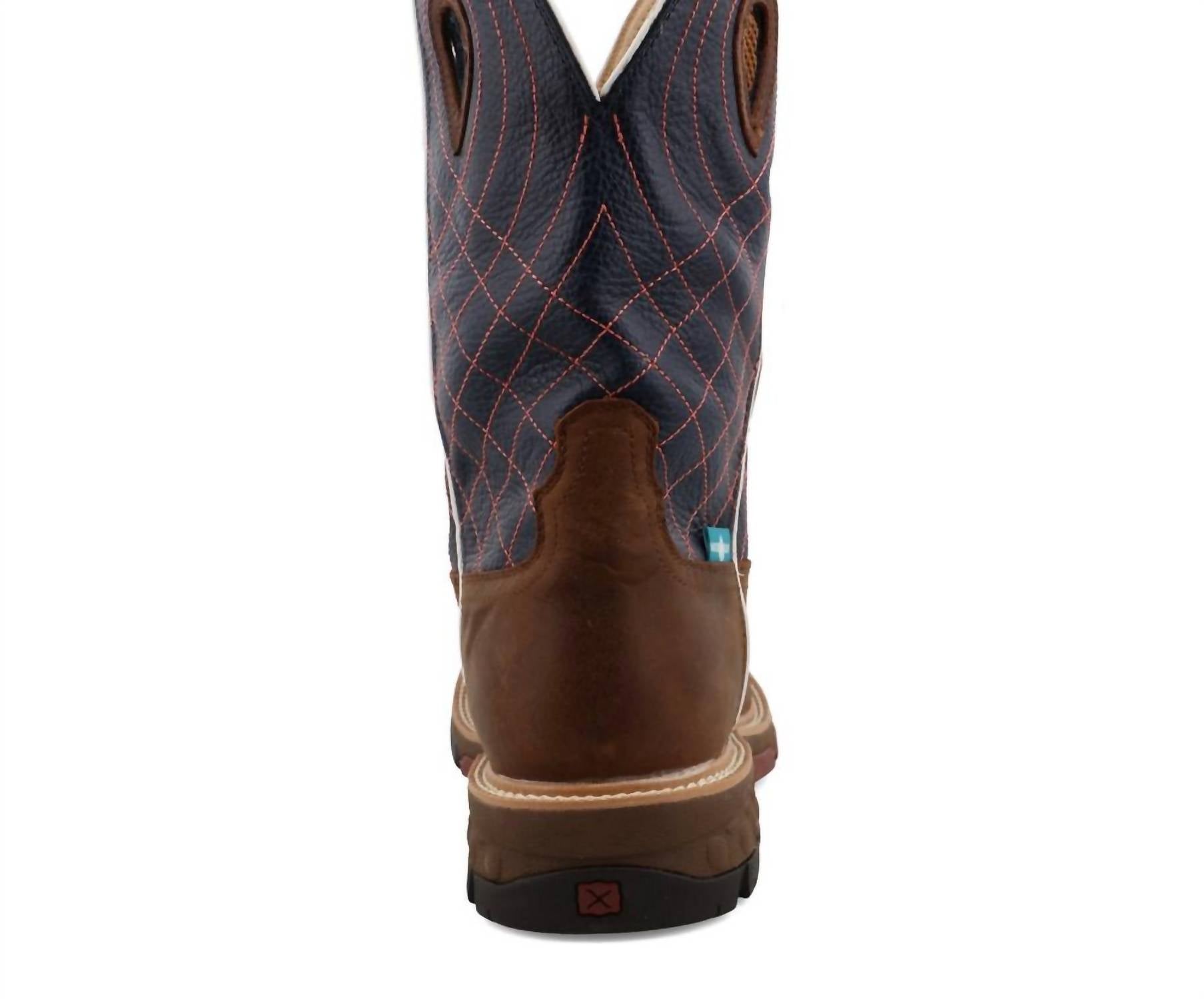 Introducing the Men's 12" Western Soft Pull On Work Boot by Twisted X in a rich mocha and navy colorway. Handcrafted from signature full-grain leathers, these cowboy & western boots feature Twisted X's patent-pending CellStretch® comfort technology for superior comfort with every step. These boots boast a squared toe shape and are designed to reduce weight by 15% compared to previous models. Perfect for demanding work environments, they combine a compression-molded EVA midsole with a nylon/glass fiber shank for stability and support, offering both durability and slip-resistant outsoles.