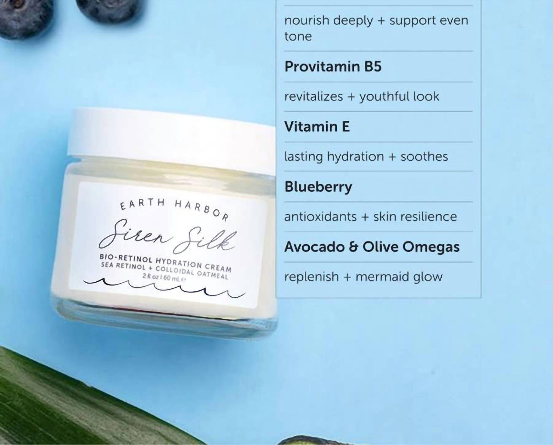 Introducing the Siren Silk Bio-retinol Hydration Cream by Earth Harbor Naturals, a luxurious treatment that rejuvenates and hydrates for visibly smoother skin. Perfect for addressing fine lines, dryness, and loss of elasticity, this anti-aging cream is packed with purely natural, vegan, and cruelty-free ingredients. Made sustainably in small batches in the USA, it offers a gentle care routine without any nasty synthetics, GMOs, gluten, or soy. 100% organic and fair trade, it's a commitment to both your skin and the planet.