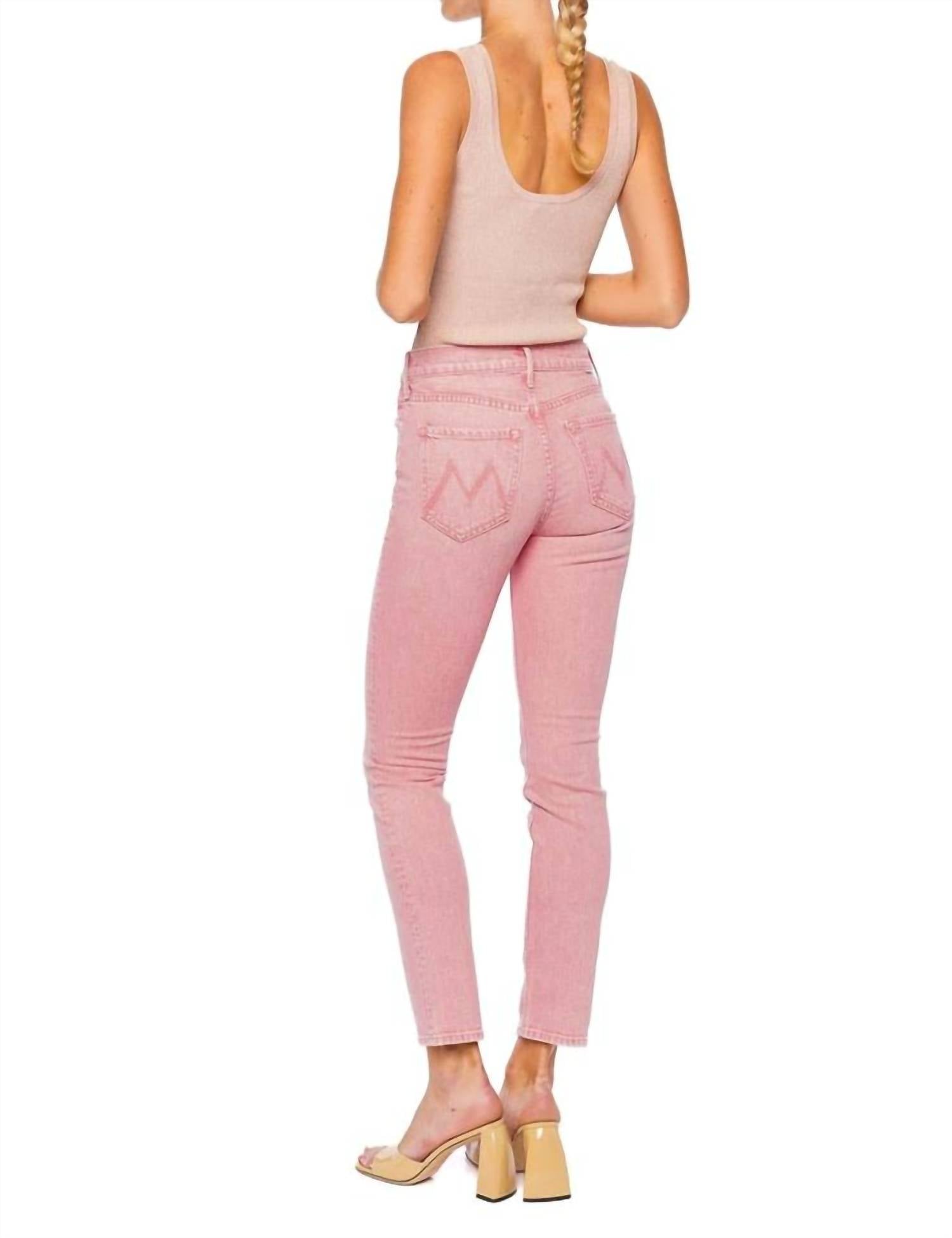 The perfect cropped jean for those transitional seasons. Introducing the Mid Rise Dazzler Ankle Jeans by Mother, a must-have for those seeking a timeless fit with a streetwear edge. These best-selling, mid-rise jeans feature a regular fit and straight leg, designed to hit just at the ankle with a clean hem. Crafted from a superior cotton blend, including 79% cotton, 20% post-consumer recycled cotton, and 1% elastane, they come in a washed sunset coral with faded details for a vintage-inspired look. Made in Los Angeles and featuring a button closure, these rigid jeans have a 9 3/4" rise, 27 1/2" inseam, and a 13" leg opening, perfect for your spring concert wardrobe.
