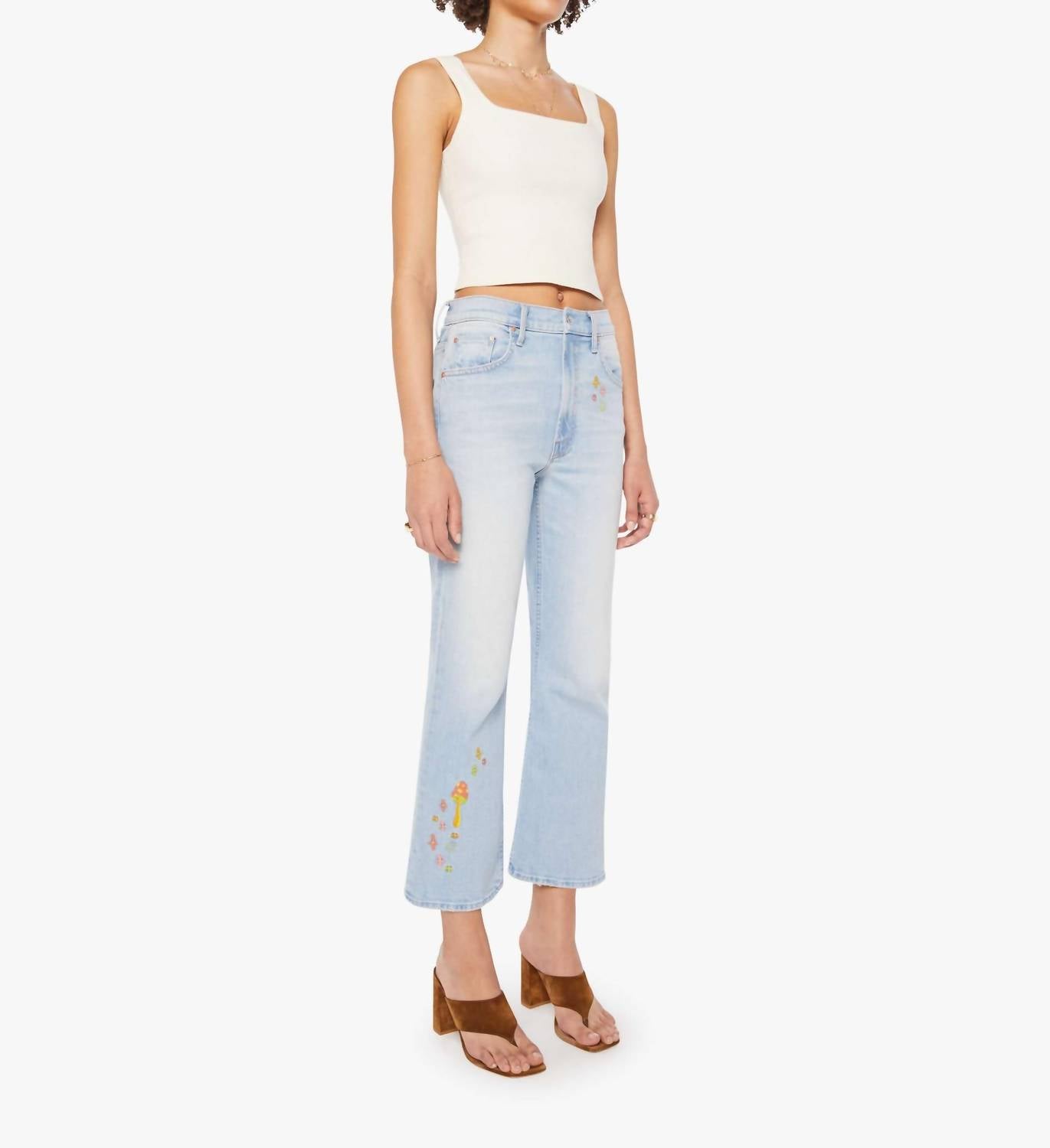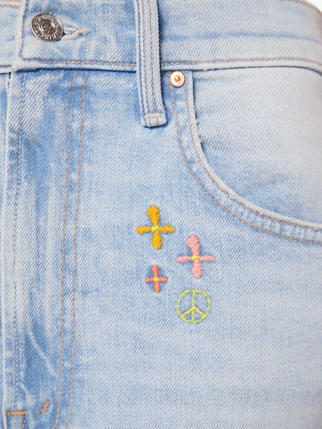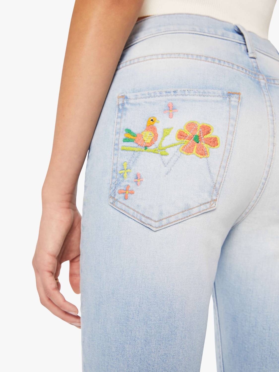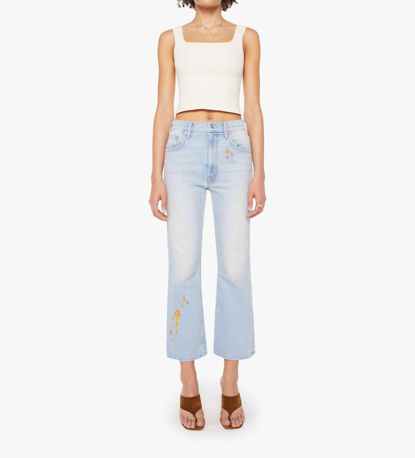 Just as cute as they are comfortable. Discover the Scooter Ankle Pants by Mother, perfect for your spring streetwear look with a lively flair. These women's jeans feature a flared leg and a slim fit, highlighted by the colorful embroidered flowers and mushrooms in Going Out On A Limb. Made from a cotton blend with a super high rise and a 27.5" inseam, they offer a slouchy style with a button closure. Crafted to elevate your holiday party ensemble, these jeans exude a playful yet sophisticated vibe.