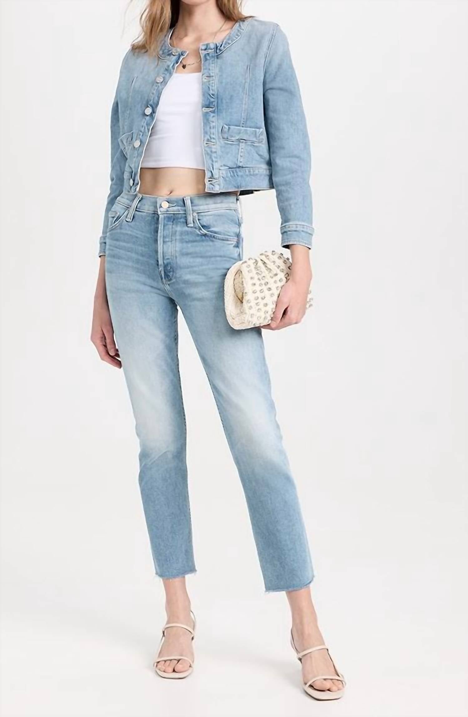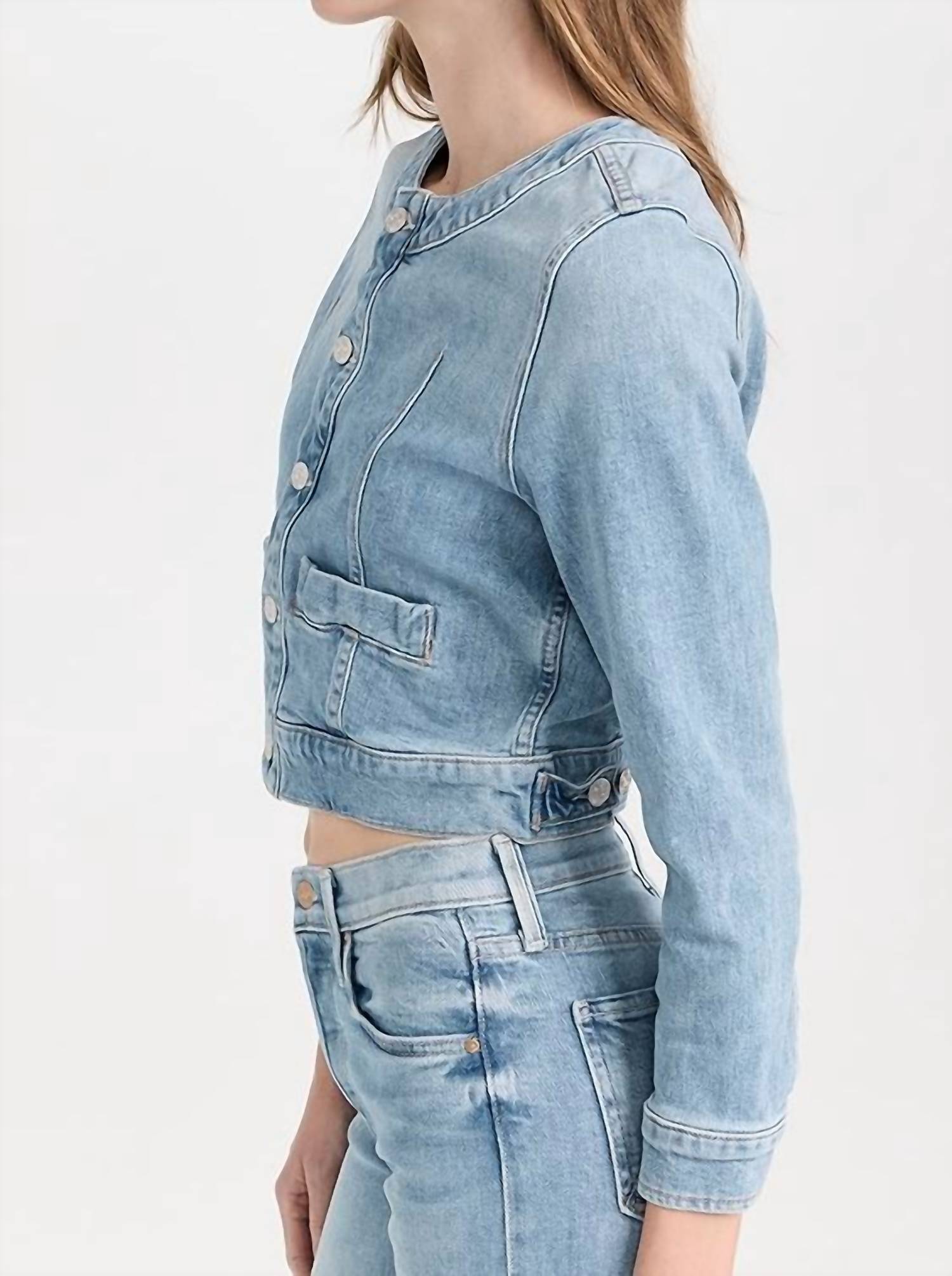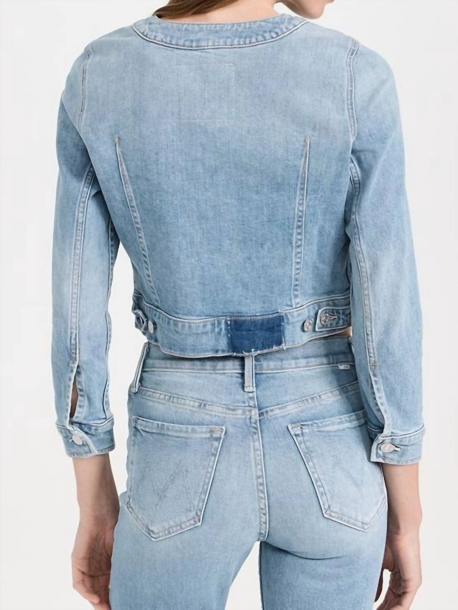 Classic, cool and works with almost any outfit choice. Meet the Picky Cropped Denim Jacket by Mother, a streetwear staple in the vintage-blue Let Them Eat Cake wash. This jacket features long sleeves, crafted from a cotton blend in a semi-rigid texture, making it perfect for the fall season. It includes a crewneck and convenient slit pockets, with button closures for a chic, fitted look. Ideal for holiday parties, note that it runs small—Mother advises sizing up.