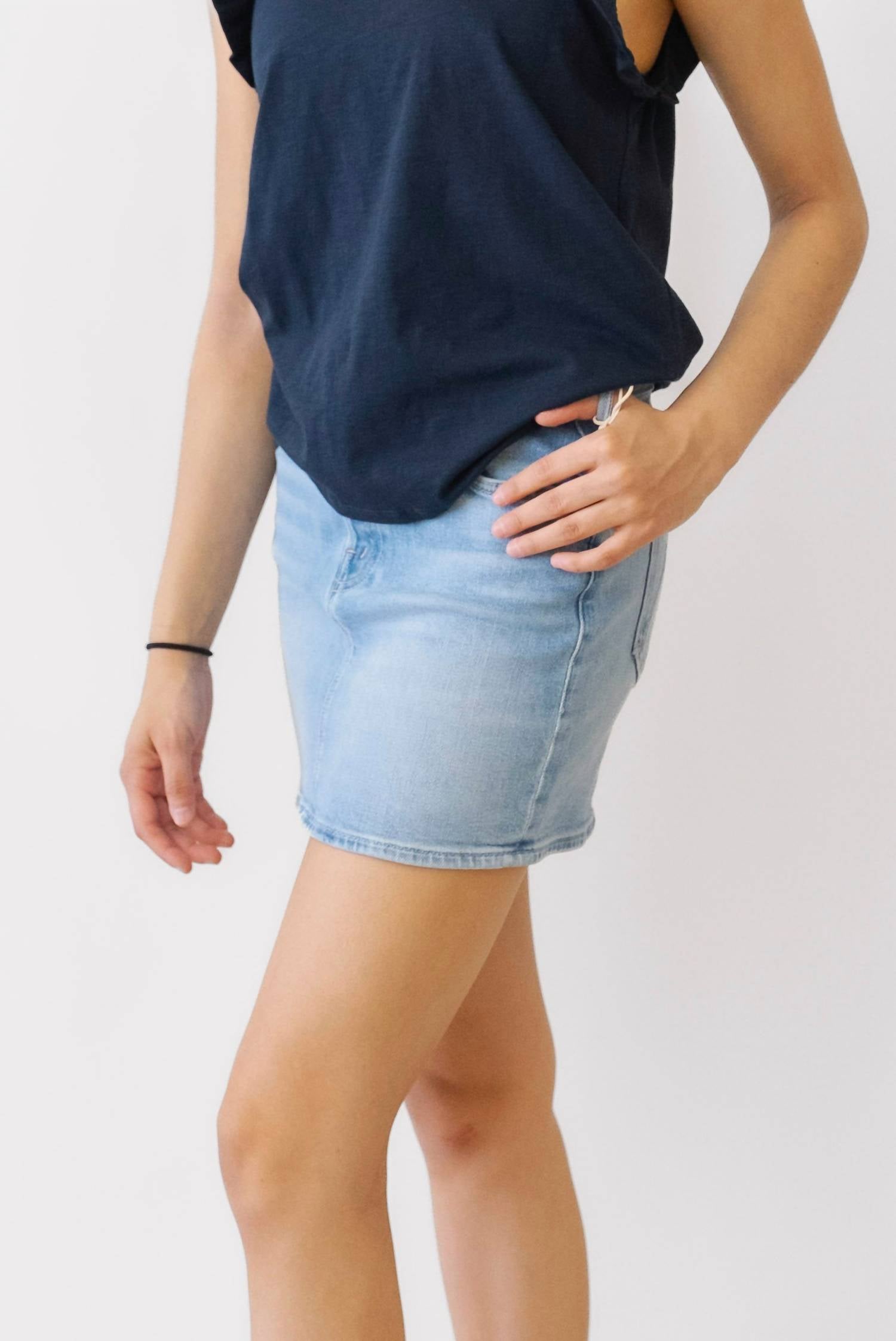 Tuck in your favorite tee for a more laid-back vibe. Step into nostalgic flair with the Vagabond Mini Skirt by Mother, featuring a whimsical "Tune in Tune Out" design perfect for summer getaways. This mini skirt is crafted from a soft cotton blend—84% Cotton, 13% Recycled Cotton, 2% Poly, 1% Elastane—known for comfortable wear. Closure: The distinctive button fly adds a quirky touch. Care: Machine wash and tumble dry for easy maintenance, making it ideal for carefree vacation styling.