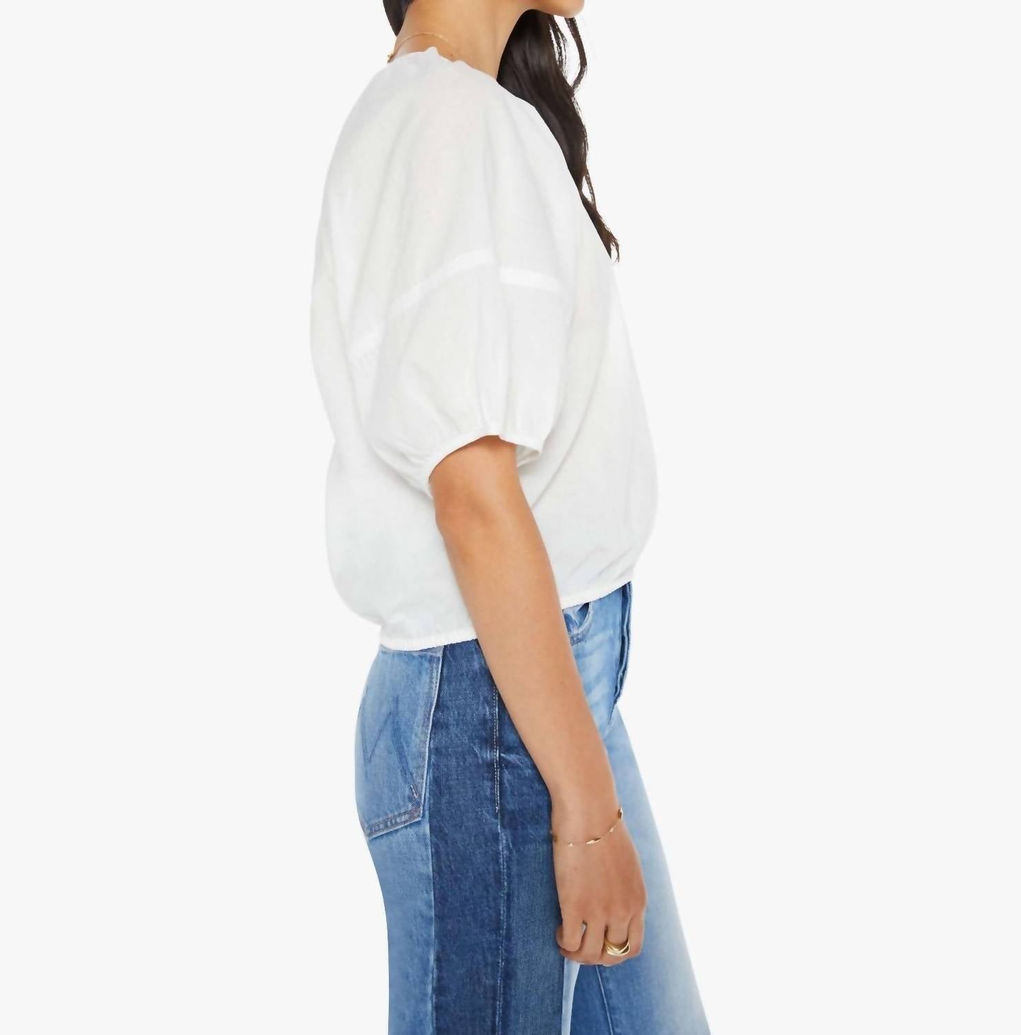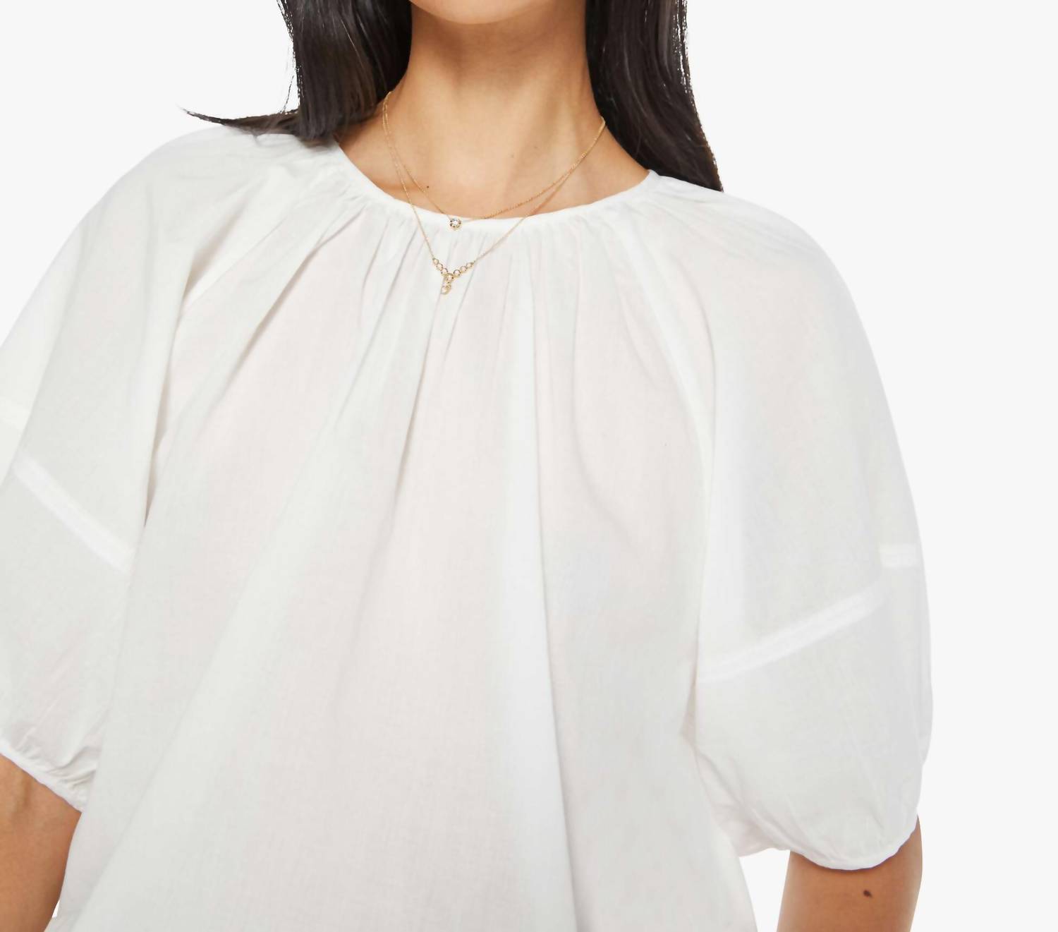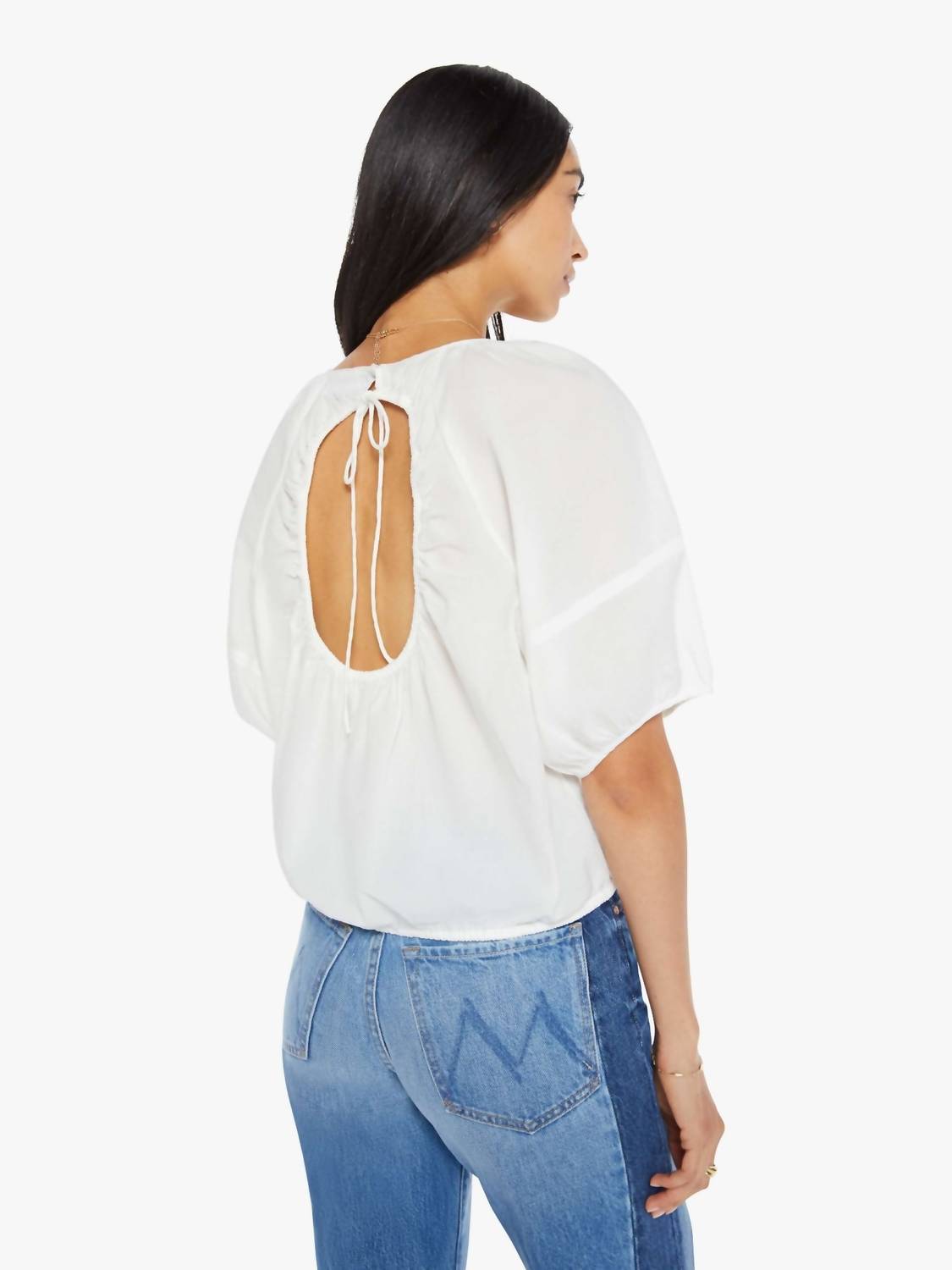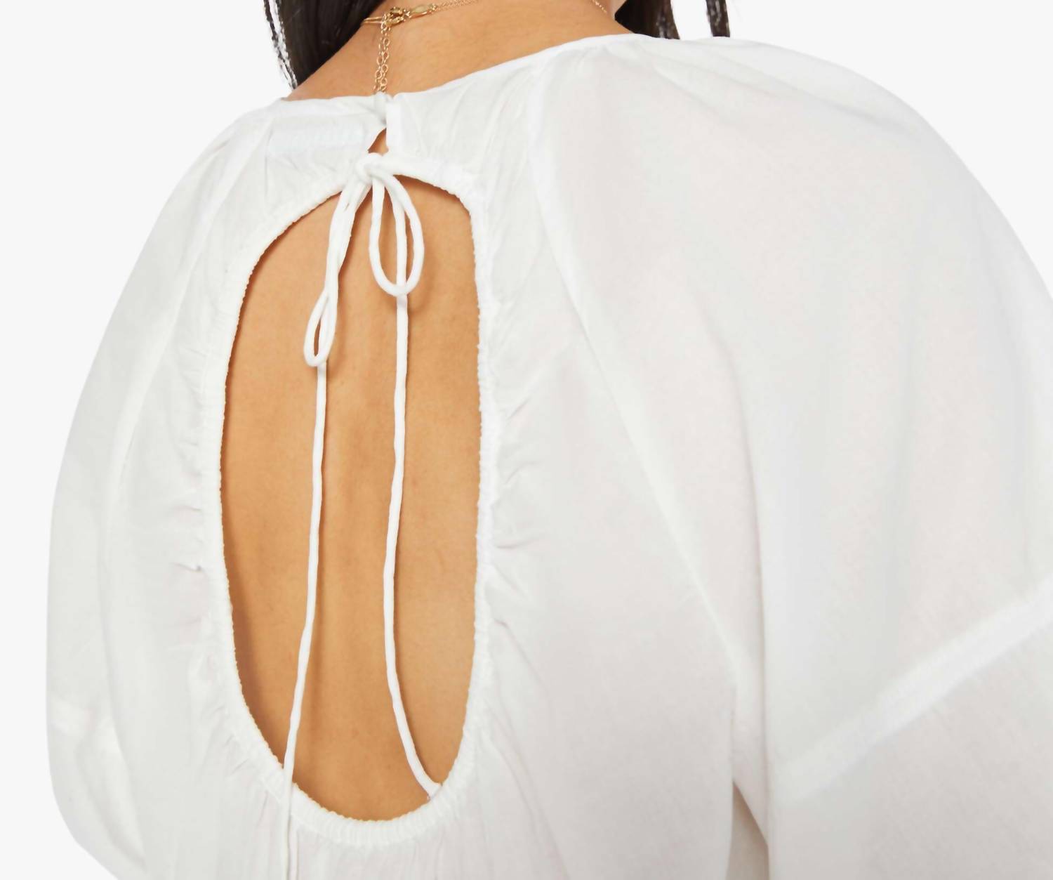 A versatile blouse that works from desk to dinner! Introducing the Party In The Back Shirt by Mother, perfect for your next holiday party. This blouse features short elbow-length balloon sleeves, crafted from 100% cotton in a crisp white color named "Let's Circle Back." Designed in a minimalist solid pattern, the loose, flowy fit is accentuated by a crewneck and a unique circular cut-out at the back. Closure: Tie closure. Imported. Model showcases size small (5'10" height, wearing 26 or small bottoms).