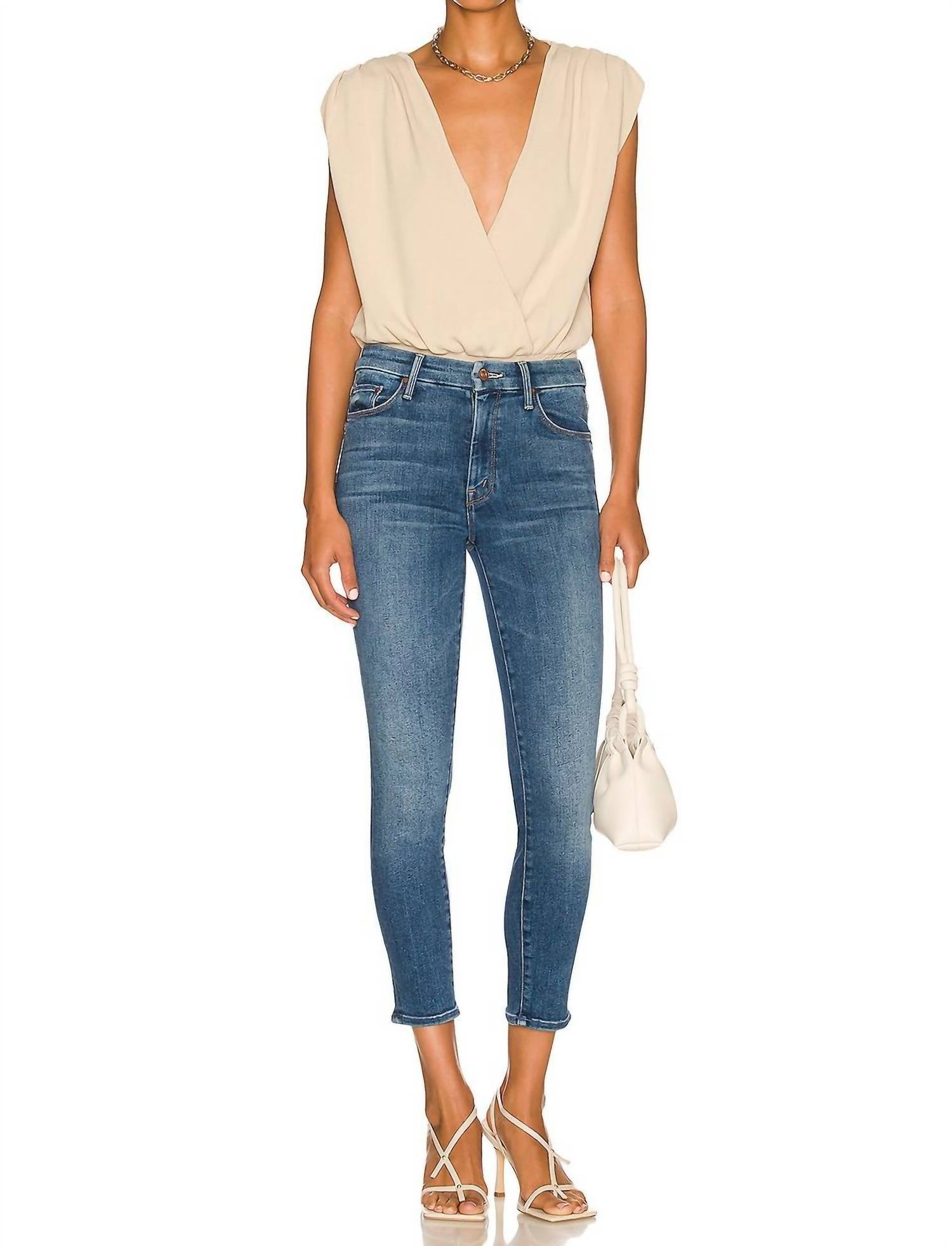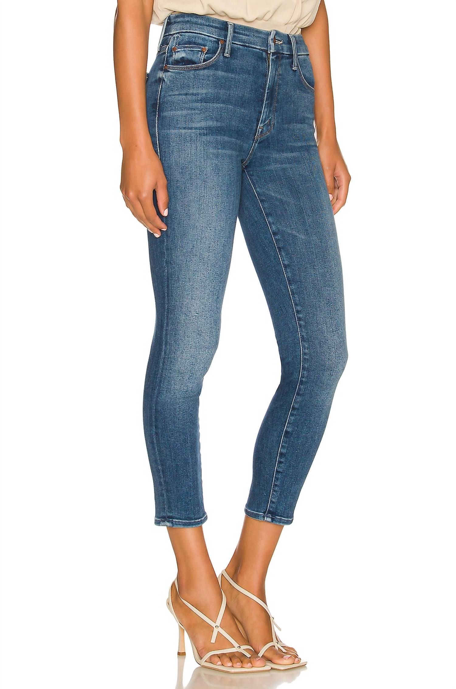 Zip fly with button closure. 5-pocket design. Slightly frayed and faded fabric. Mid-rise. Cropped hem. Skinny fit. Made from comfortable stretch denim. Mid-blue wash with fading and whiskering. 11" at the knee, narrows to 10" at the leg opening. 81% Cotton, 11% Lyocell, 6% Polyester, 2% Spandex. Machine wash. Made in the USA.