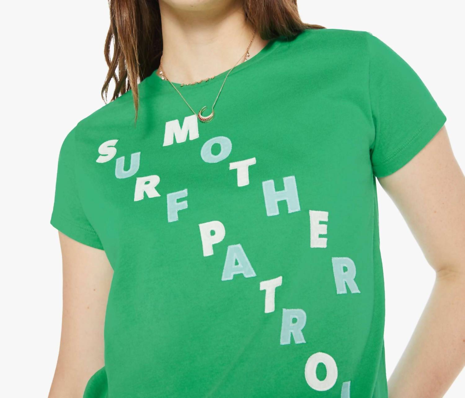 Look no further, you just found your perfect tee! The Boxy Goodie Goodie Tee by Mother is a must-have for a laid-back, summer look. This surf parol tee features short sleeves and a classic crewneck, ensuring comfort with its 100% cotton composition. Adorned with a playful embroidered applique text graphic in white and blue, it adds a vintage-inspired, graphic touch to your wardrobe. Closure: Pull on. Ideal for vacation or streetwear occasions, this tee offers a slim fit that's effortlessly stylish. Model is 5'10" and wears size small.