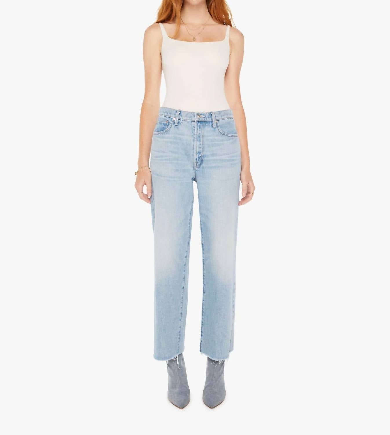 Pair these straight leg jeans with flats, sandals or even heels! You can't go wrong. Elevate your wardrobe with Mother’s Women’s I’m With The Band Jeans in a textured light blue for a chic, streetwear vibe. These high-waisted, classic fit jeans feature a wide straight leg with a frayed ankle-length hem, and come with a convenient zip closure. Crafted from superior 100% cotton, they showcase subtle whiskering and fading for added style. With an 11 1/4" rise and 27 1/2" inseam, these jeans are perfect for a relaxed spring vacation look. Model is 5'8" and wears size 26.
