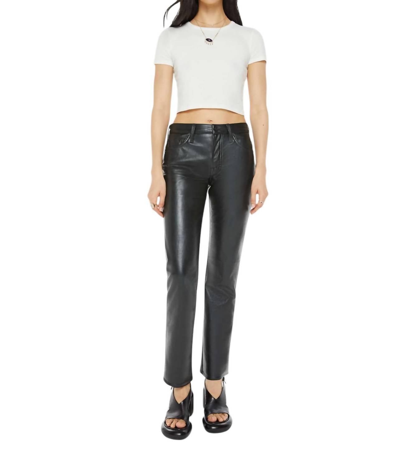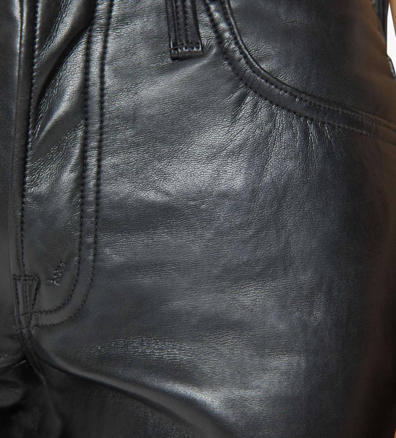 These high-waisted straight-leg pants feature a clean hem, pockets, and a zip fly closure. Made from 60% recycled leather and 40% polyester. Rise is 10", inseam is 31", and leg opening is 15". Made in Los Angeles.
