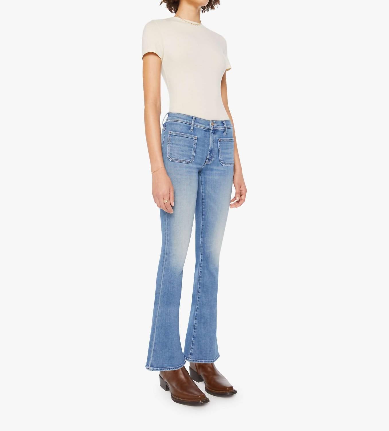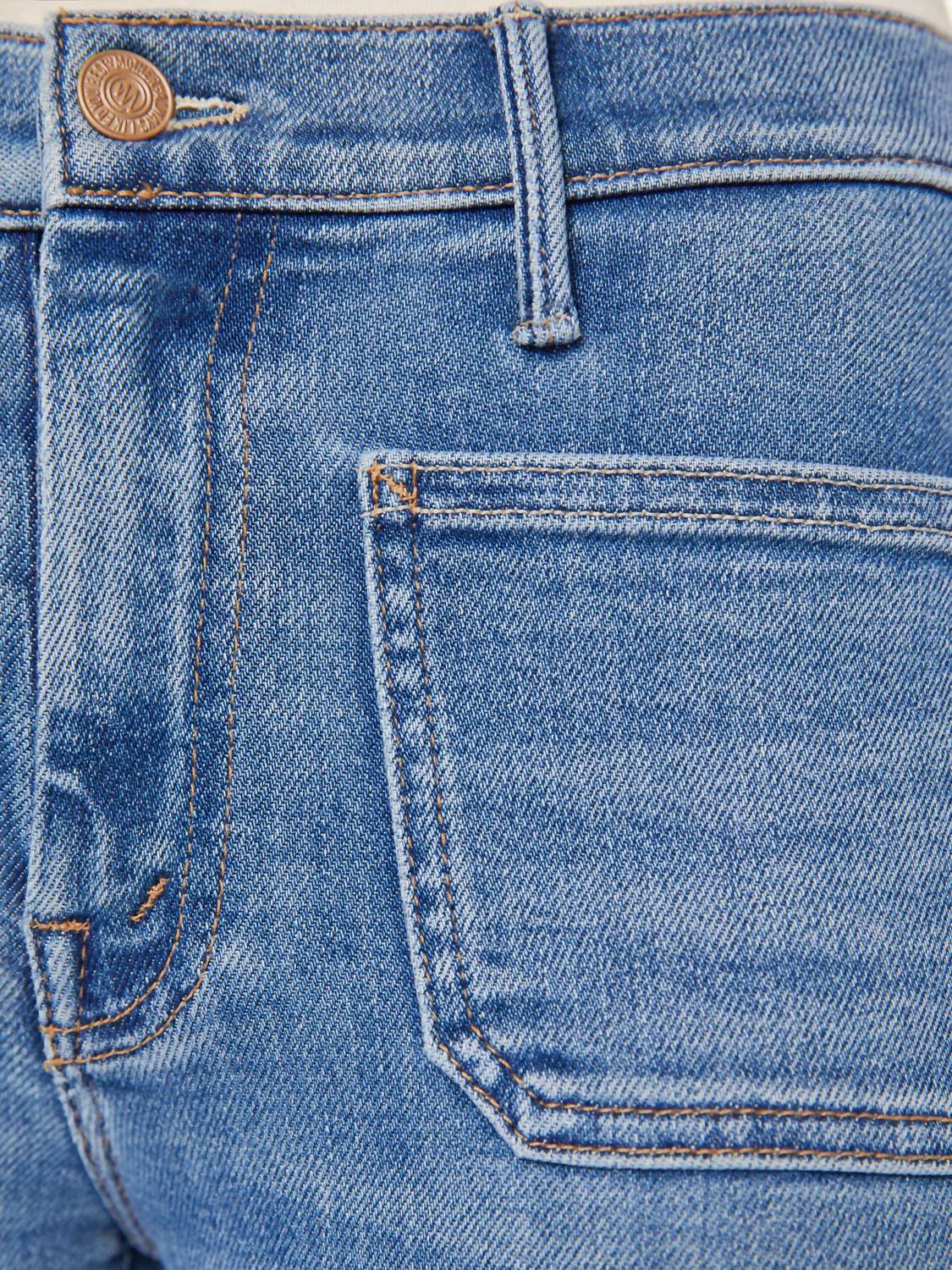 A flattering silhouette that's suprisingly versatile. Embrace effortless style with Mother's Patch Pocket Weekender Jeans in Poppin Wheelies, perfect for streetwear and holiday parties. These flared leg jeans feature a mid rise, regular fit, and a 31-inch inseam. Made from a textured cotton blend, they include practical patch pockets and a button closure. Crafted in the US, these jeans showcase a medium wash with whiskering and knee fading for a modern touch.