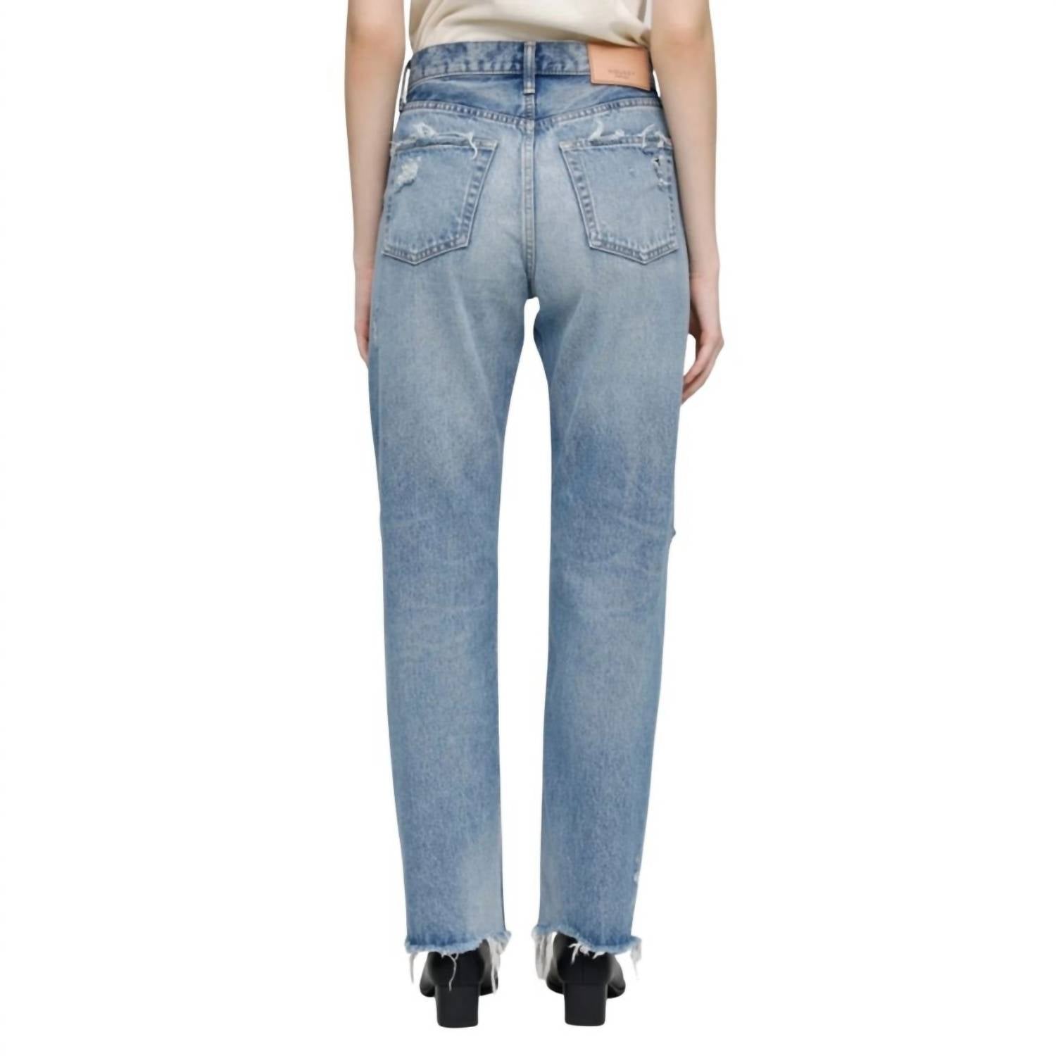 High-rise. Straight-leg silhouette. Belt loops. Five pocket styling. Button fly. Back leather patch. Non-stretch denim - 100% Cotton. Combo: 100% Cowhide Leather. Machine wash cold. Measurements - Rise: 11.25", Inseam: 30", Leg opening: 16.5". Made in Japan.