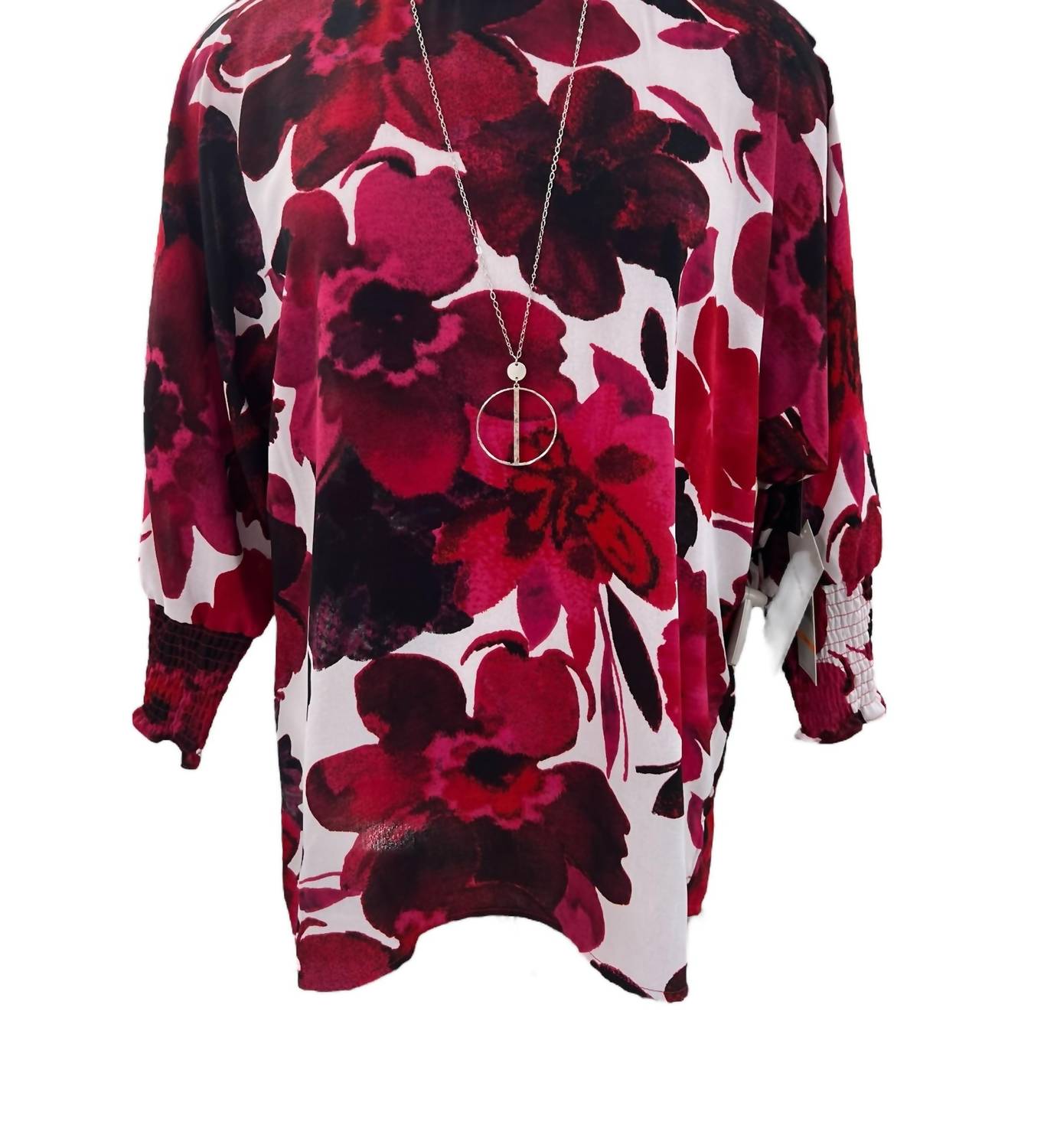 A versatile blouse that works from desk to dinner! The Dolman Sleeve Floral Top by Multiples is a delightful addition to your wardrobe, showcasing playful floral prints in white, red, and fuchsia. Highlighted by its three-quarter multi-shirred elbow sleeves and a chic boatneck, this top features a faux button back for added style. Crafted from crinkle woven polyester, it perfectly balances fun and fashion. Care: Machine wash. Closure: Button closure.